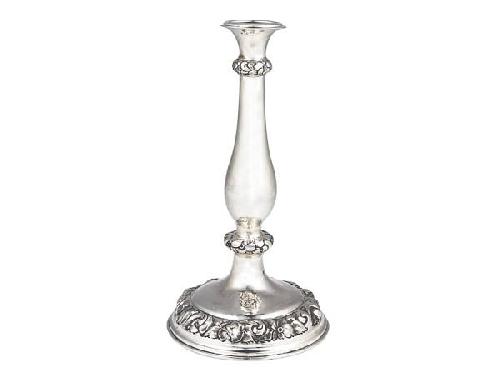 Silver, 309 g. Round base, baluster form stem divided by rings, pressed foliate motif decoration. Restored. Marked: Vienna, 1861, Thomas Dub. Neuwirth: P. 2270. Size: 31.5 cm