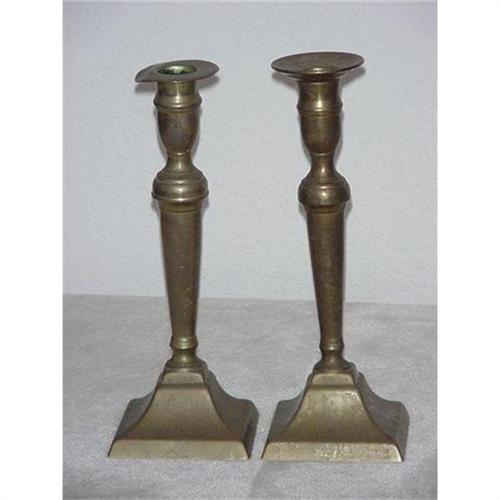 A pair of antique candlesticks, 9 1/2" tall, 3 3/8" square base. The good looking pair will add interest to a collection or just sitting on your table. The condition is good, the top of one stick is bent as you can see in the photo, otherwise they are very nice. (3)