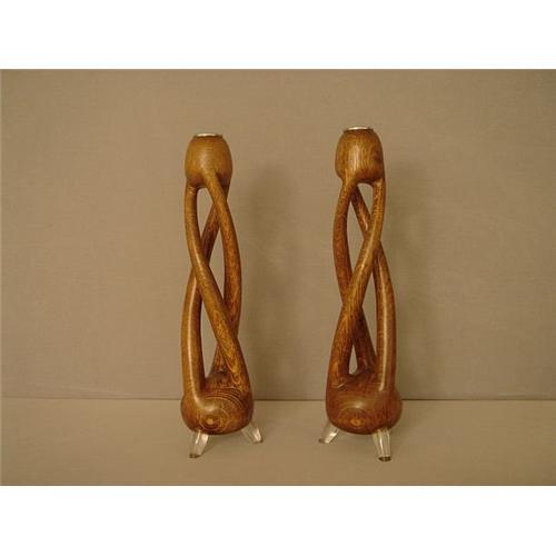 These are a fascinating pair of candlesticks!I have never seen any others like them!They are carved out of one piece of wood really amazing workmanship.I think it is oak wood, but I am not completely sure.They have little lucite feet and chrome inserts at the tops.They are a good size 10.5ins high and at the widest point of the wood 2.5ins wide. Together they weigh 10.5ozs.I would estimate them at the late 40s.They are an absolute object of art, would of course also look wonderful with slim line candles in them!