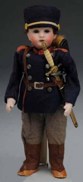 Description Germany, Ca. 1900. Bisque head incised "10-17", features inset glass eyes, painted eyelashes, multi-stroked eyebrows, open mouth with teeth, original brown mohair wig. Candy box body with bisque hands. Original uniform. Condition (Excellent). Size 8" T.