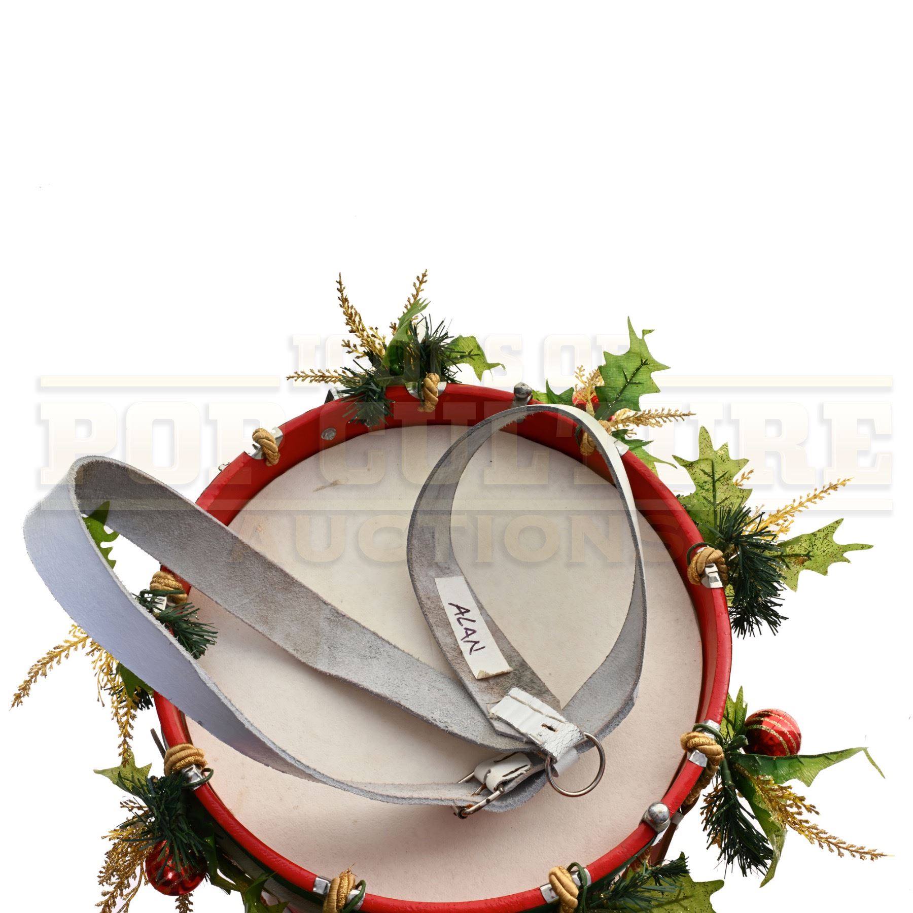 A festive and eye-catching screen-used marching band drum from the holiday comedy Candy Cane Lane. This vibrant prop drum, adorned in classic red and green with gold rope lacing, features decorative holly, pine, and ornament embellishments wrapped around the rim, perfectly capturing the film’s over-the-top Christmas spirit. The drum includes its original pair of wooden drumsticks and a production-labeled shoulder strap marked “Azlan,” identifying the background performer who used it on set.
