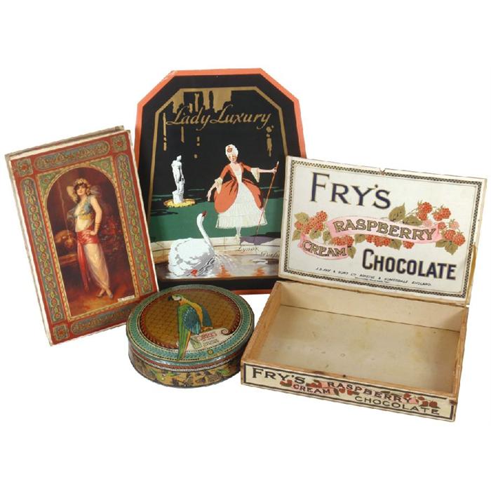 Candy items & perfume sign (4 pcs): c.1910 Lady chocolate box, c.1920 Fry's Raspberry Chocolate box,