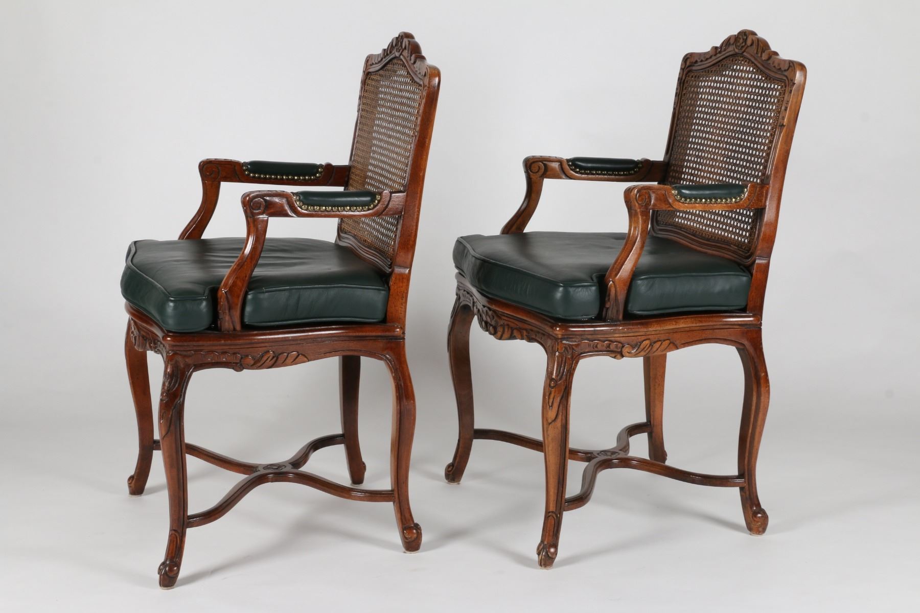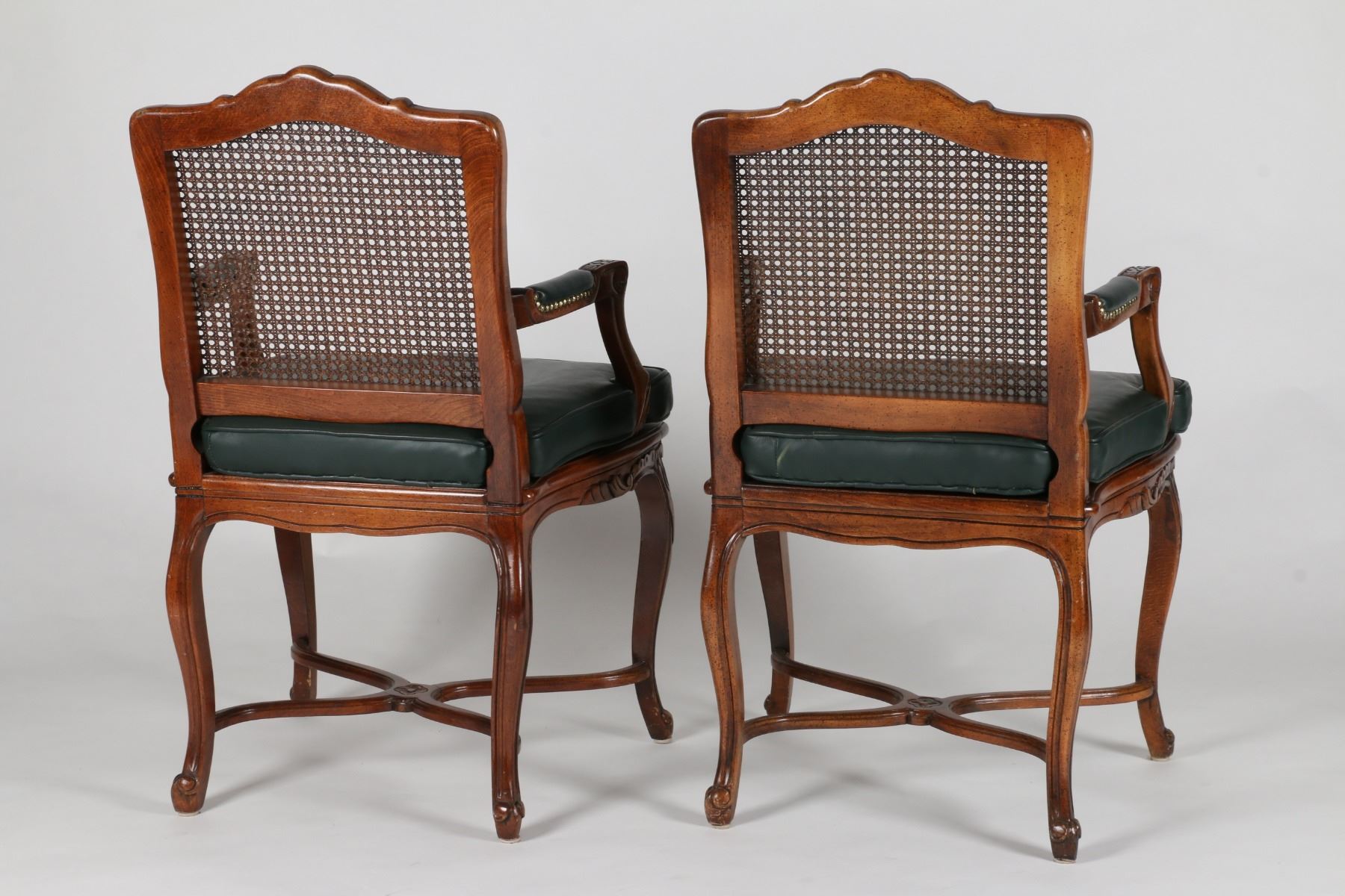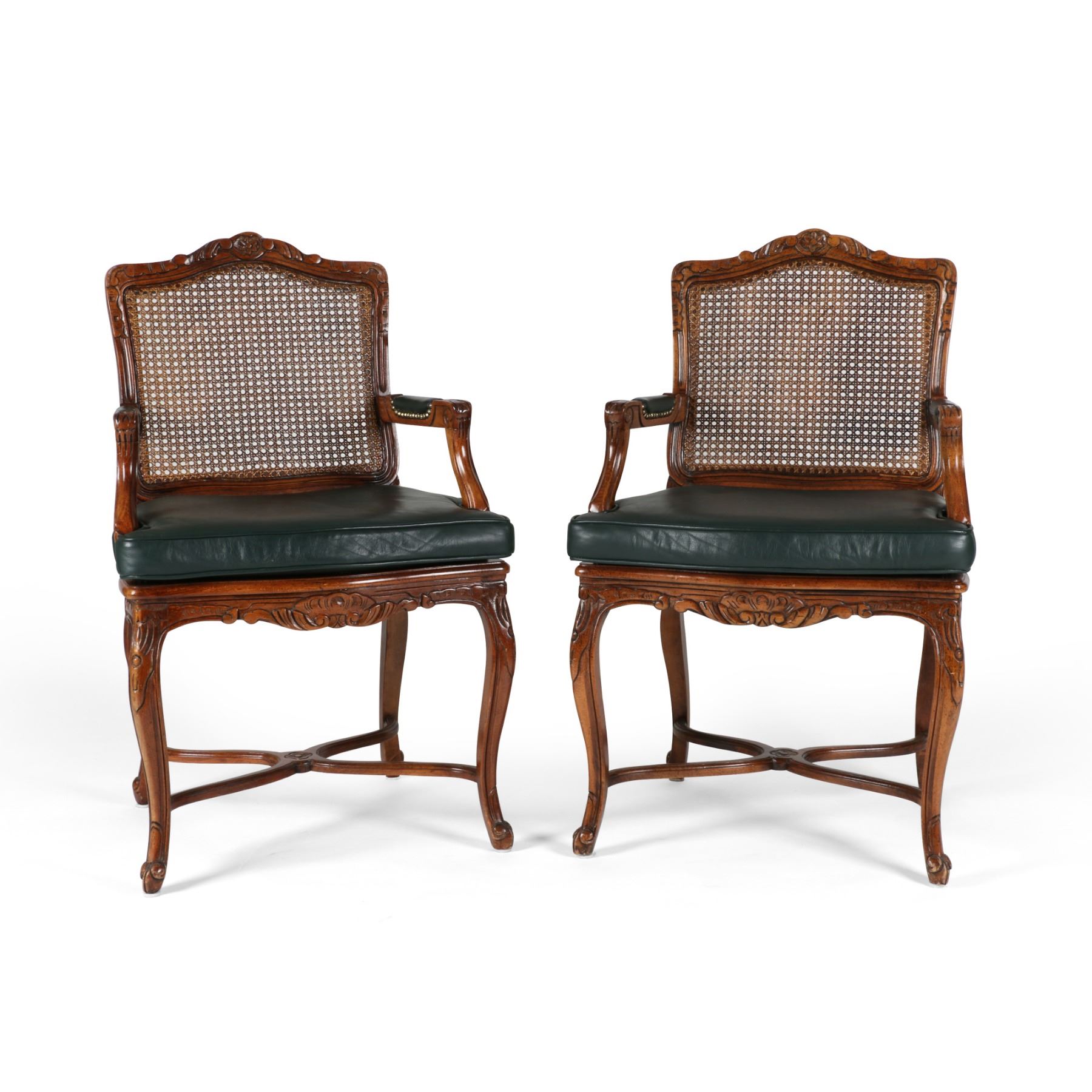 Two (2). Late 19th Century. Stretcher base. Fully restored with leather upholstery. 23" x 18.75" x 38". Green leather seats professionally upholstered. 300-500.