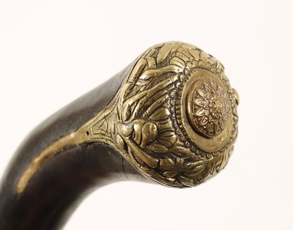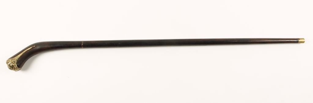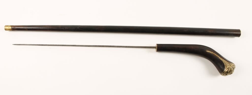Metal butt cap from a flintlock pistol. Condition is overall fair for its age. The brass butt cap is starting to loosen on one side. It also shows an old repair to the wood. 3 sided blade measures 15 1/2 ", cane measures 35" overall. Not for sale in the state of California or New Jersey.