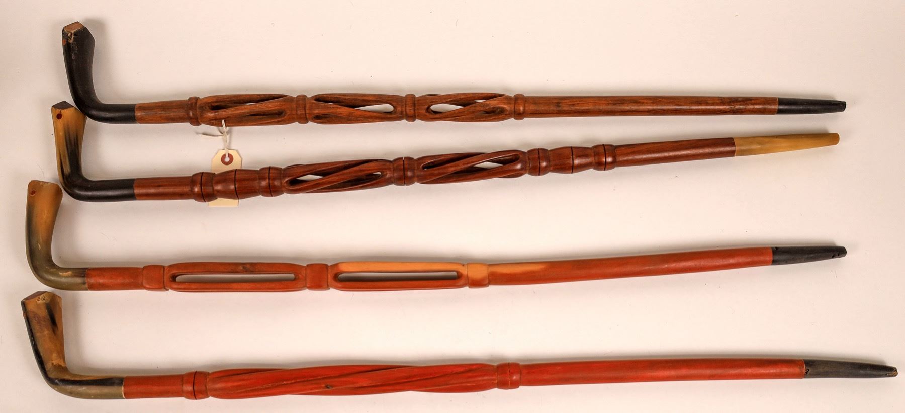 Lot of 4. Canes are L horn handle hand carved. Woods are Bubinga, Afromosia Sapele and possibly Sedua. Kudu Horn handles. Two canes are carve in a spiral, hollowed out fashion. Brought over 1970ís and in excellent condition. 37 in. In length. State: City: Date:1970s Provenance: