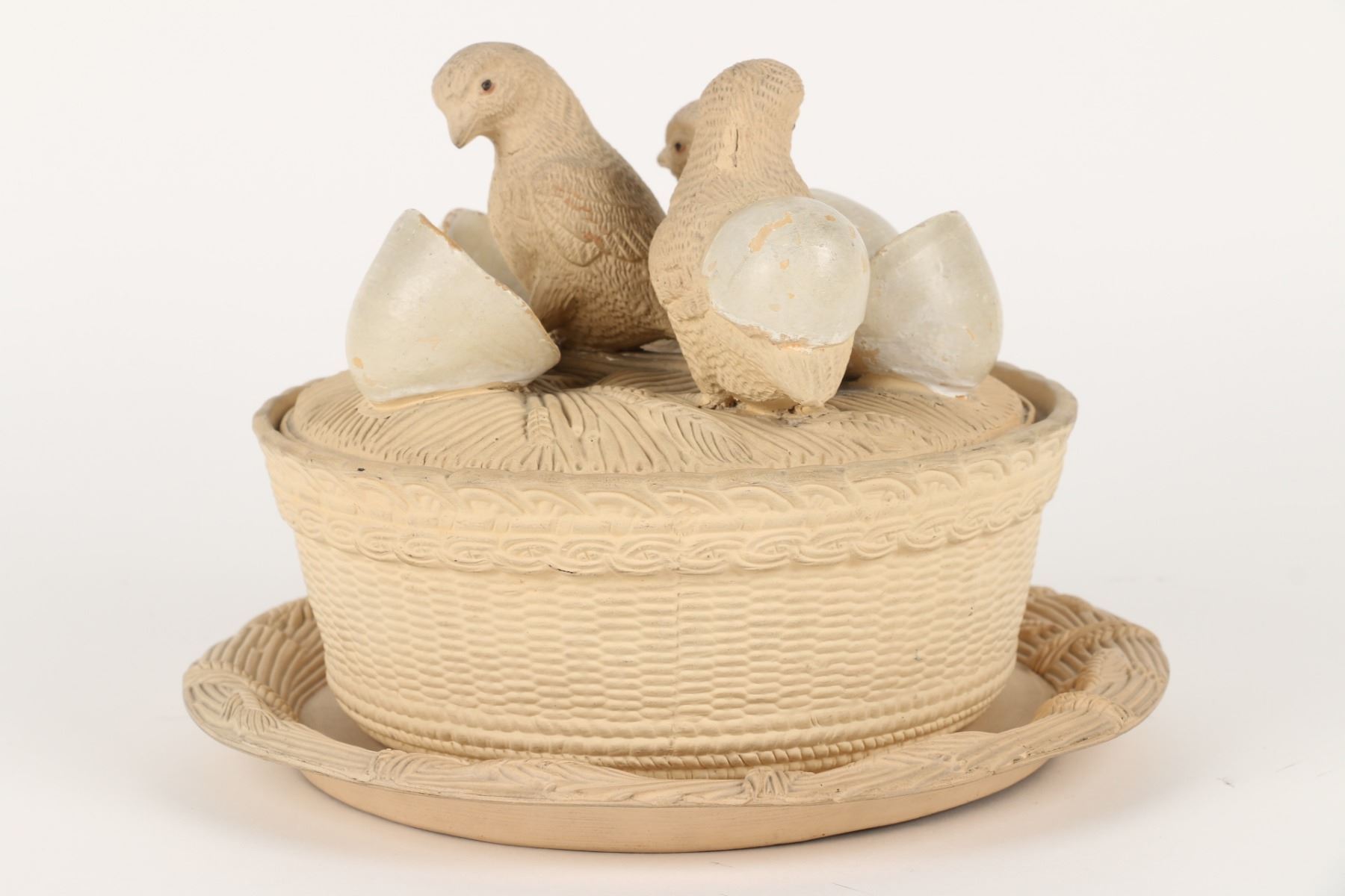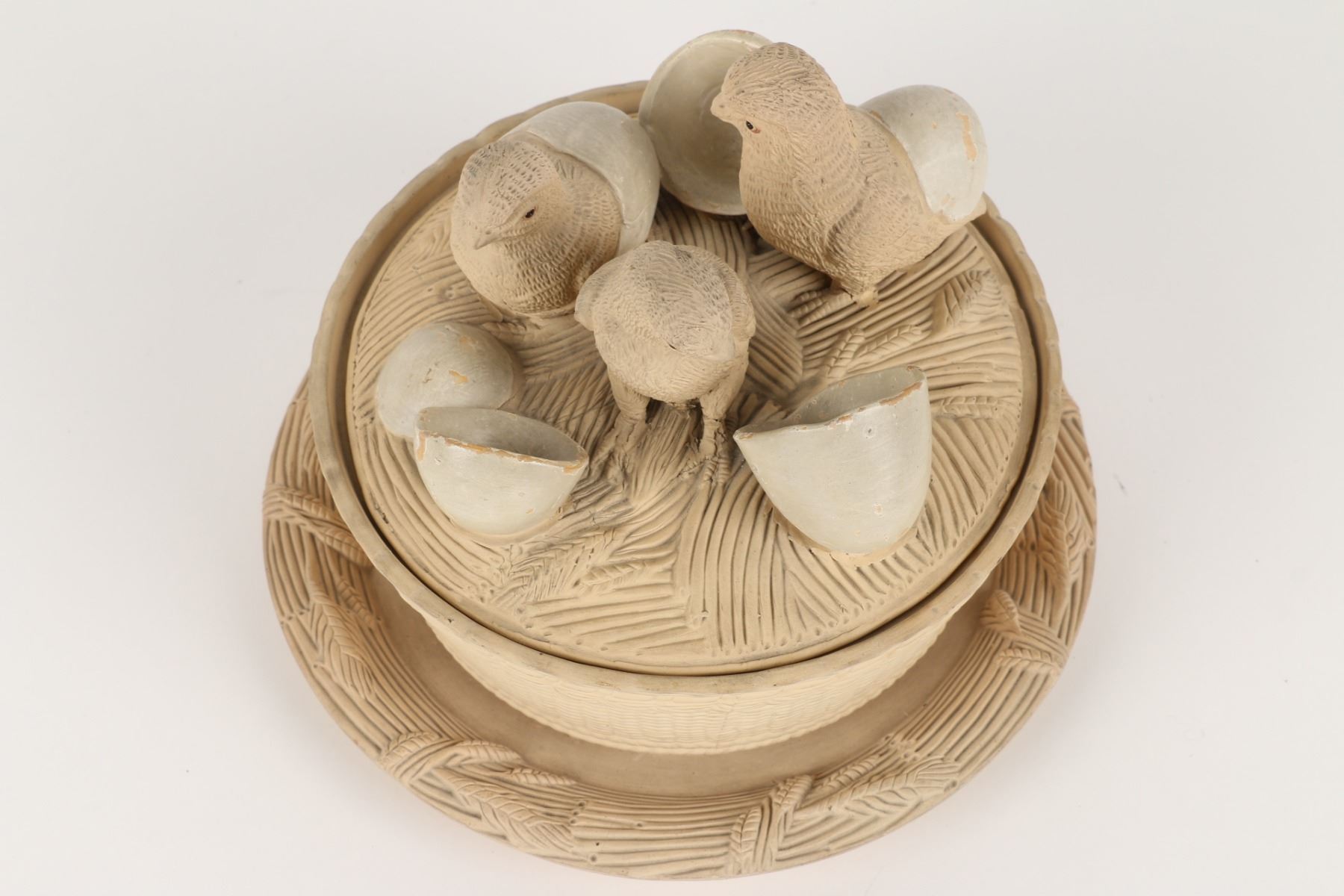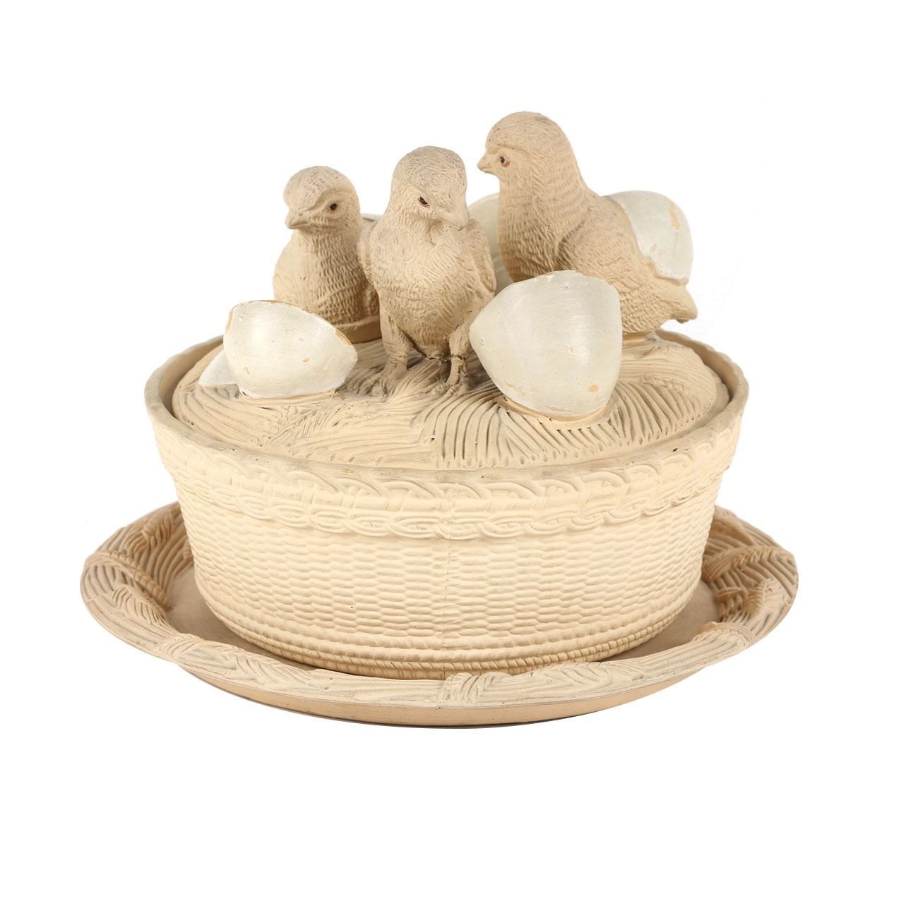 Lot 411 - Late 19th Century. Czechoslovakian. "Hatching Chicks" by William Schiller & Sons. Matte finish to all pieces. Eggs with slip glaze colour, lid and underplate with wheat in relief. Underplate 9" dia. Egg shells with some very minor glaze loss. $200-300.