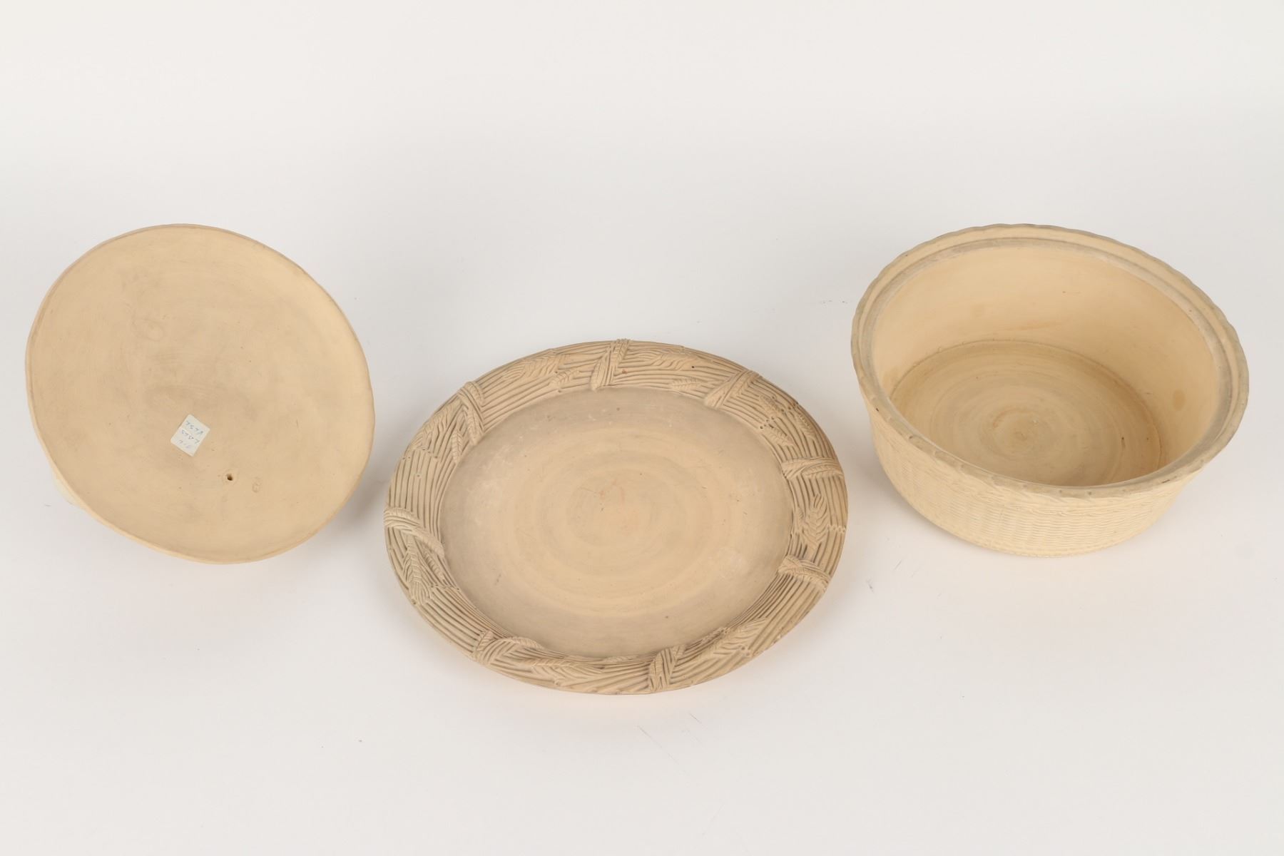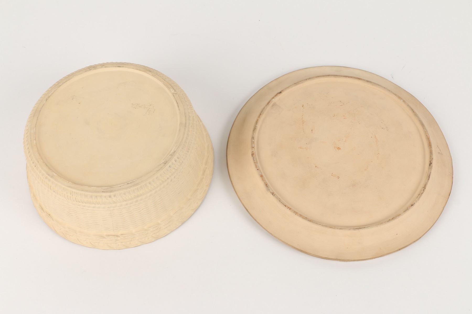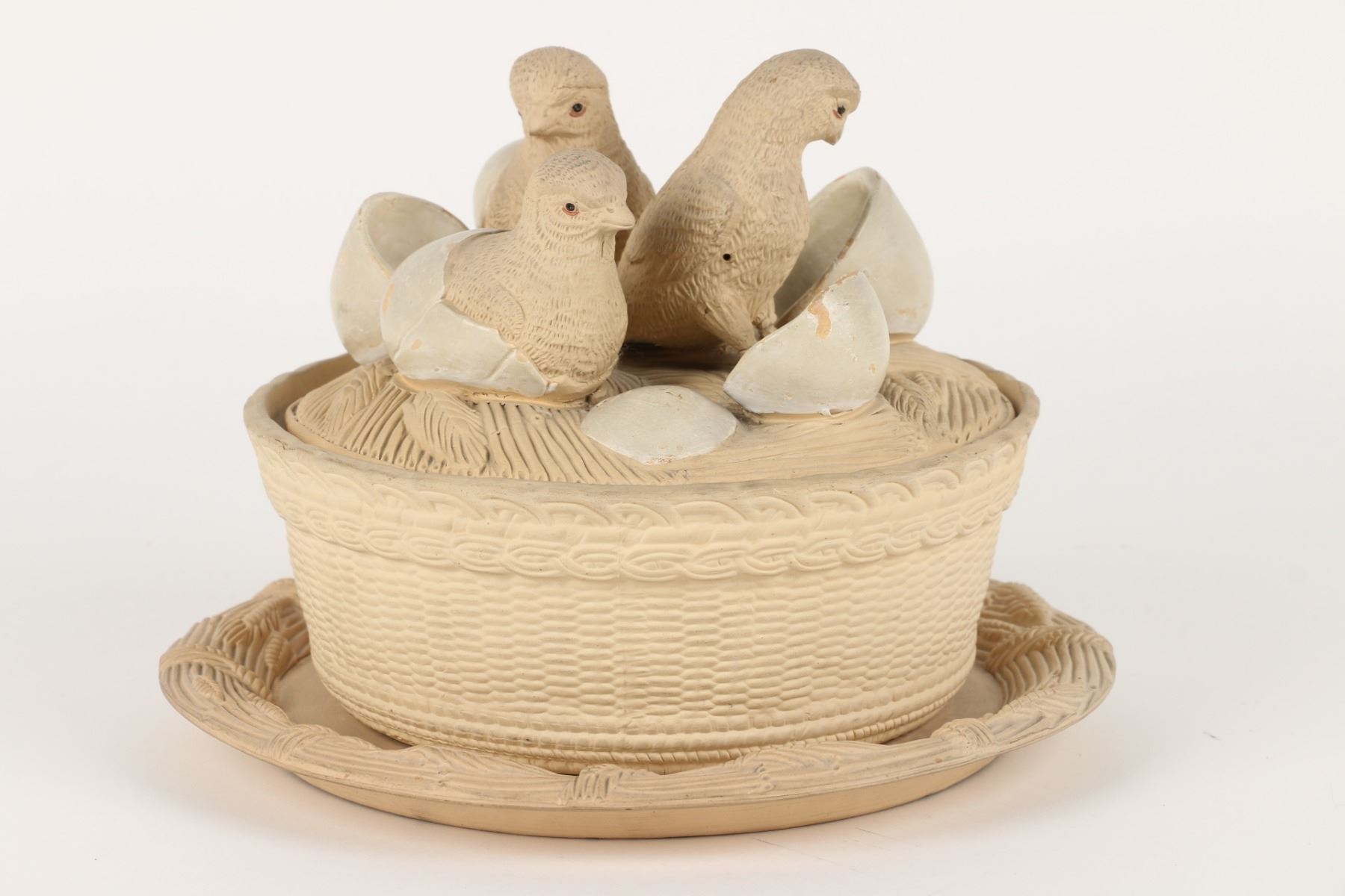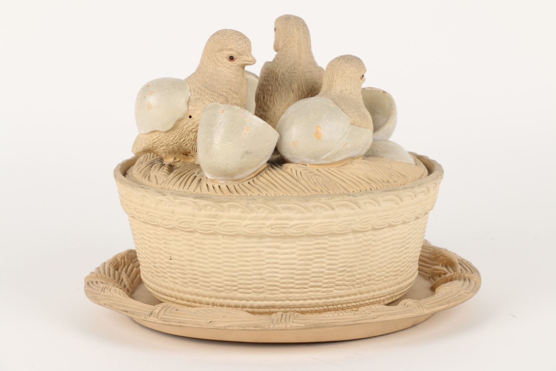 Lot 411 - Late 19th Century. Czechoslovakian. "Hatching Chicks" by William Schiller & Sons. Matte finish to all pieces. Eggs with slip glaze colour, lid and underplate with wheat in relief. Underplate 9" dia. Egg shells with some very minor glaze loss. $200-300.