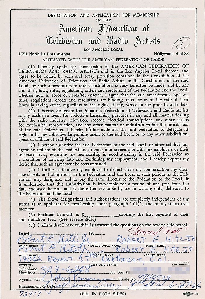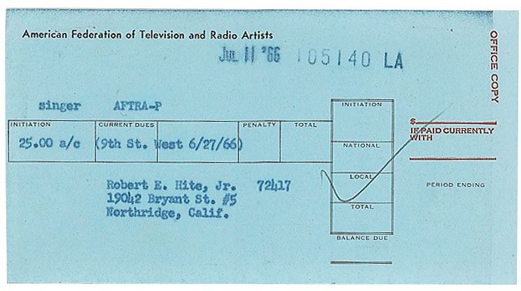 Lead singer (1943–1981) of the American blues-rock band Canned Heat, who died of an accidental heroin overdose. Partly-printed DS, signed four times, “Robert E. Hite, Jr.,” one page, 6 x 8.75, June 27, 1966. Application for membership in the American Federation of Television and Radio Artists (AFTRA), signed four times at the conclusion by Hite (twice in cursive and twice in print), and filled out with his address and telephone number. In fine condition. Accompanied by a blue carbon copy receipt.