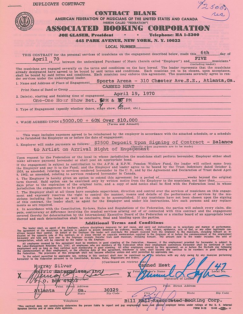 DS, signed “Samuel L. Taylor,” two pages, 8.5 x 11, April 6, 1970. Performance agreement and attached rider for Canned Heat’s performance at the Sports Arena in Atlanta, Ga. Signed in blue ink by bass player Larry Taylor with his real name “Samuel L. Taylor,” signing as the leader. In fine condition, with expected document wear. Accompanied by a ticket stub from the performance.
