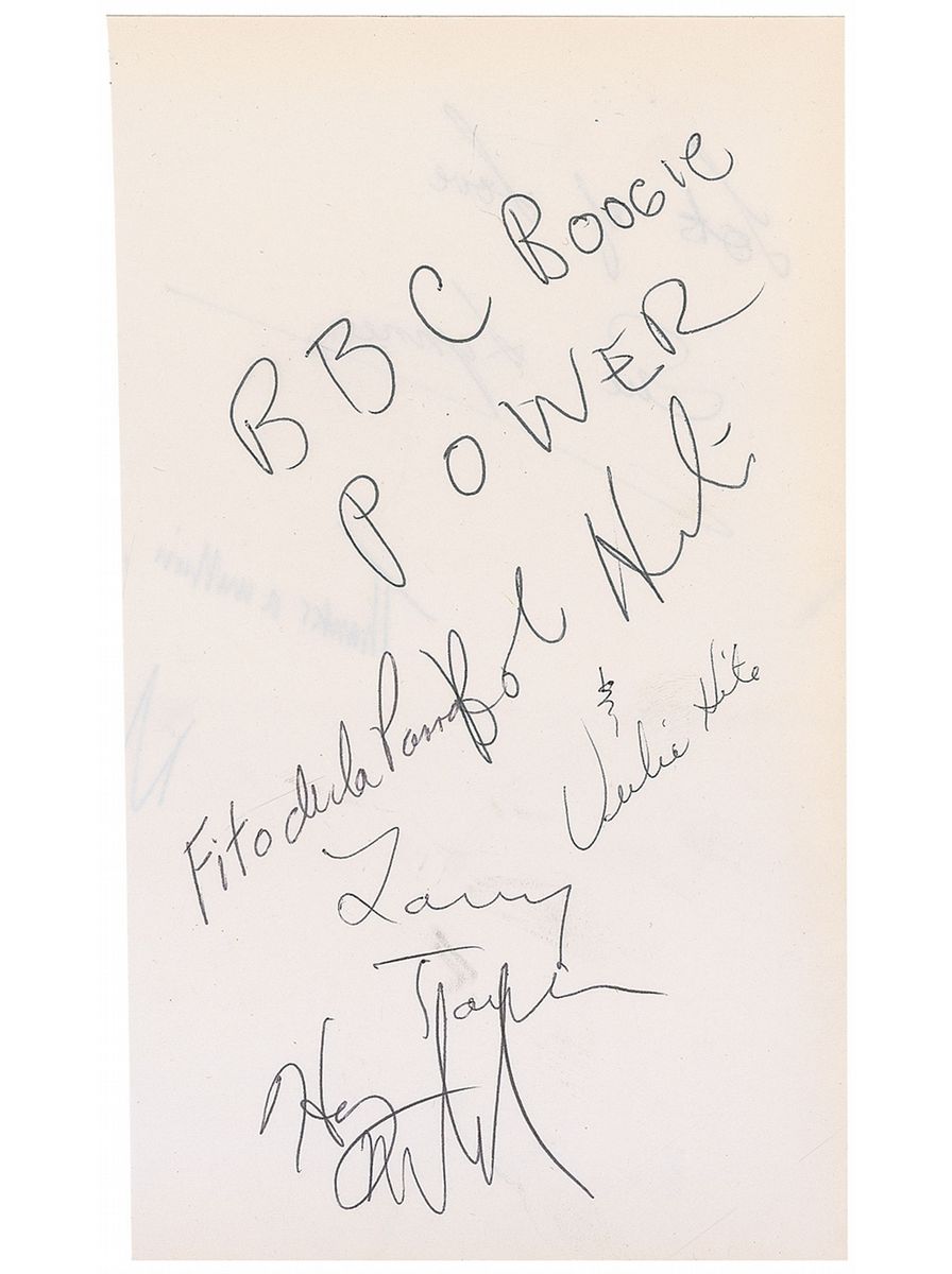 Uncommon ballpoint signatures, “BBC Boogie Power, Bob Hite,” “Fito de la Parra,” “Harvey Mandell,” “Larry Taylor,” and “Verlie Hite,” on an off-white 4.5 x 8 sheet. In fine condition, with mild toning to borders and slight show-through from signatures to reverse.