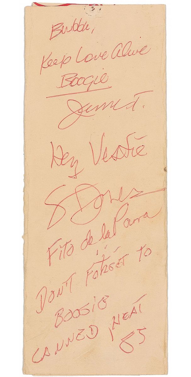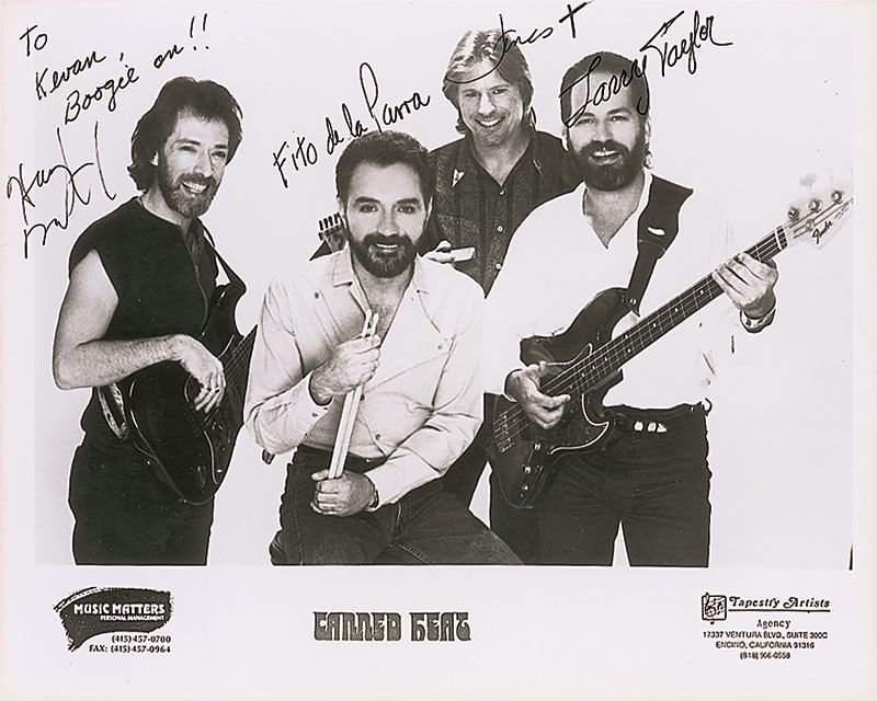 Glossy 10 x 8 publicity photo, signed and inscribed in black ink by Henry Vestine, Fito de la Parra, Larry Taylor, and James Thornbury; and ballpoint signatures of Henry Vestine, Fito de la Parra, Skip Jones, and James Thornbury on an off-white 8.25 x 7.75 sheet. In overall fine condition, with a tack hole and some toning to the signature sheet. Accompanied by a certificate of authenticity from Roger Epperson/REAL for the signature sheet.