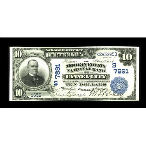 <B>Cannel City, KY</B></I> - $10 1902 Date Back Fr. 617 <B>The Morgan County NB</B></I> Ch. # (S)7891<BR>This gorgeous Third Charter Date Back $10 has exquisite pen signatures and excellent eye appeal. It comes from a rare one bank town, and only two 1902 Date Backs appear in the latest census. <B>Extremely Fine.</B></I><BR><BR><b>Shipping:</b> Coins & Currency (<a target="_blank" href="http://www.heritageauctions.com/common/shipping.php">view shipping information</a>)