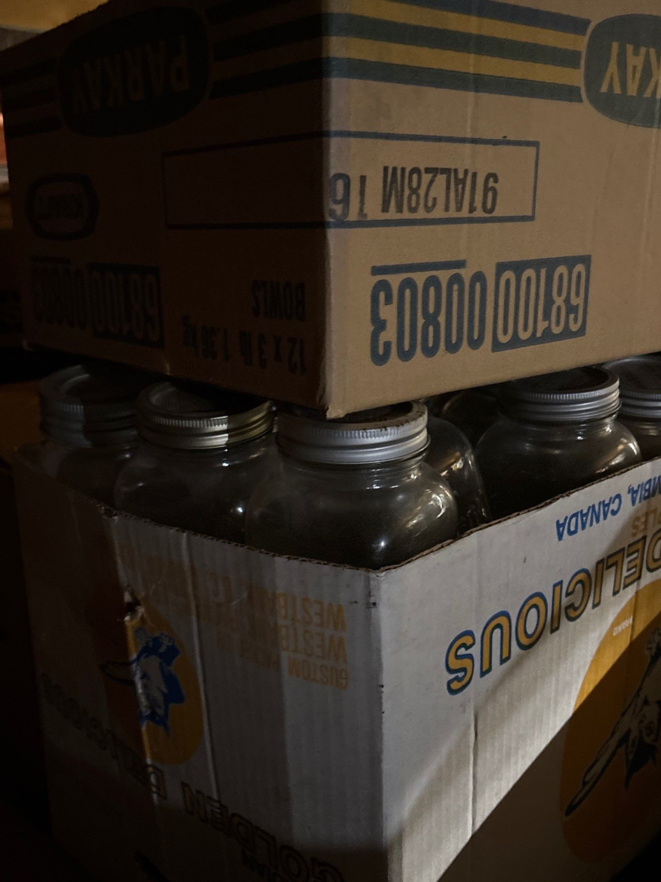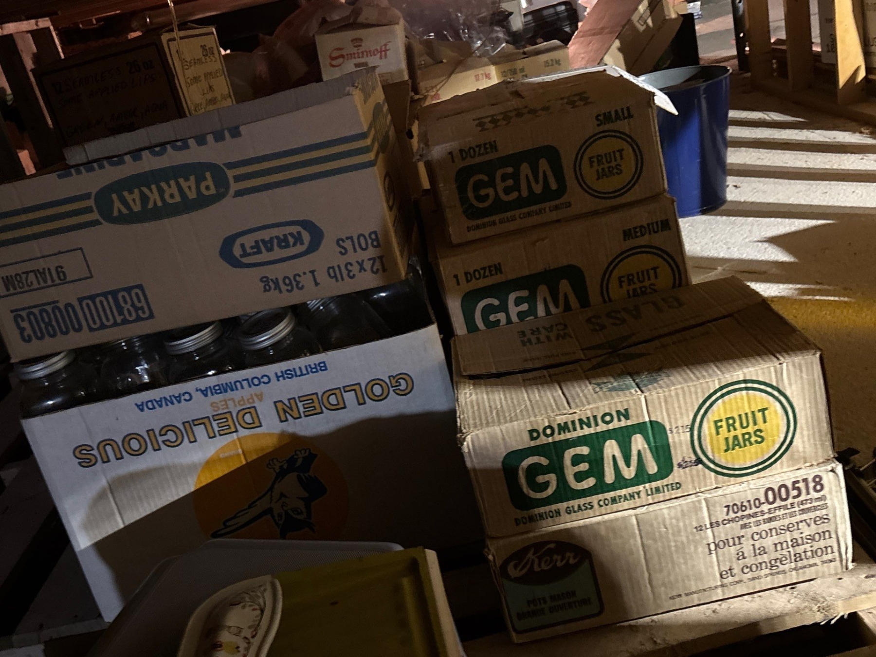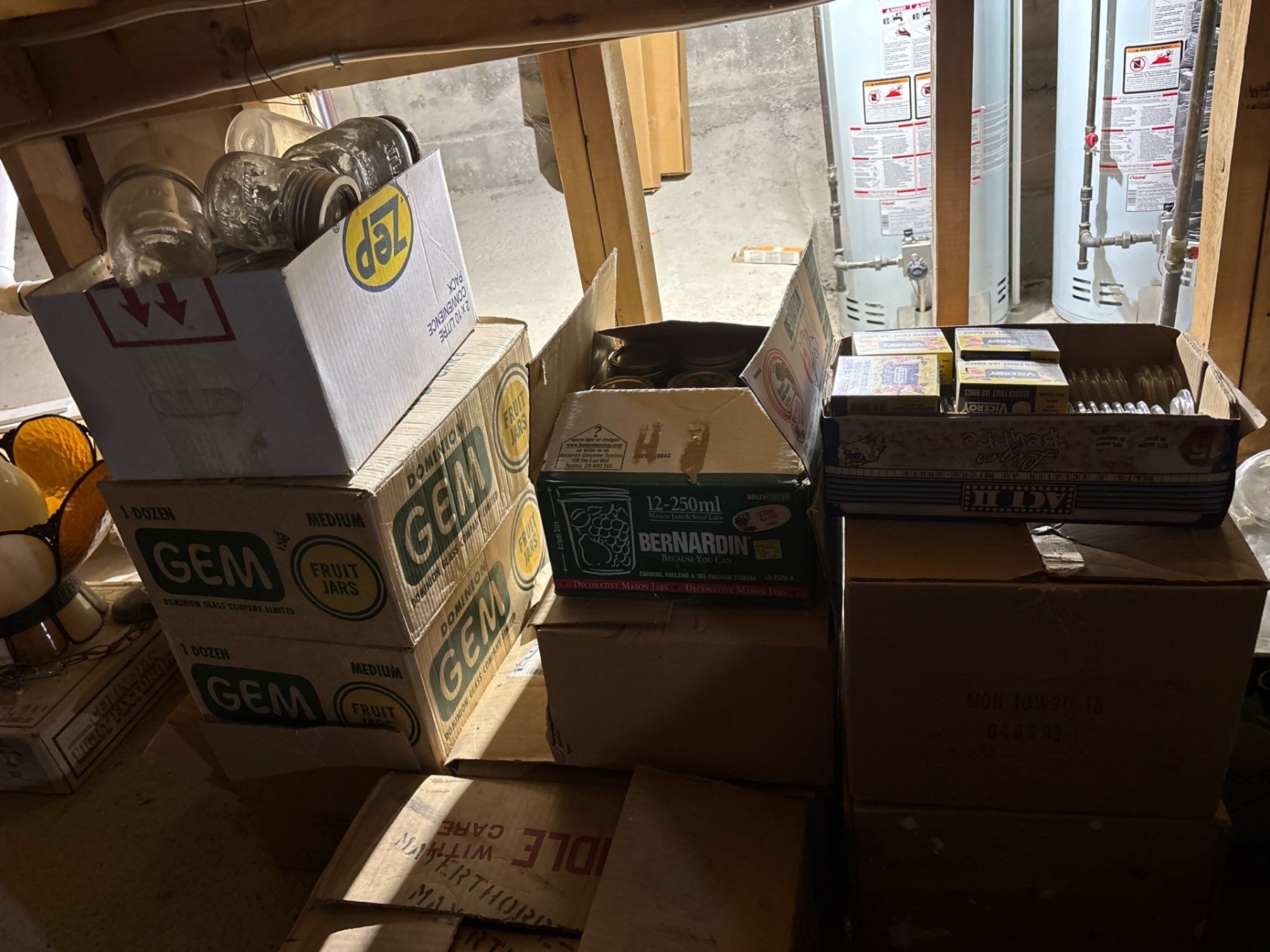 Canners dream huge amount of canning supplies, small jars, medium size jars, large jars, a number of