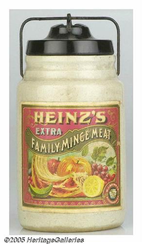 <B>Canning Crock Container Labeled "Heinz's Extra Family Mincemeat"</B></I>Heinz's graphic advertising of the turn of the century carried through to their product container. The color label on this canning crock container proves to be one of the nicest and rarest of their brands. The original label is only enhanced by the excellent form of the 8 1/2"canning crock with its snap lid. The label has two light digs to the paper in two letters of the wording and one with minor paper loss along the right edge. Heinz colors usually were in the green and red variation; this label is in a bright purple which accents the colors of the fruit. Lot:252