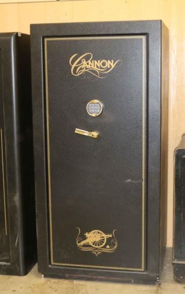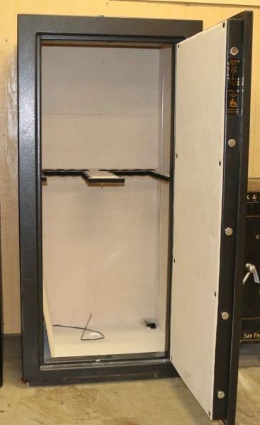 Black with gold accents measures 30"X26"62" interior rifle racks and shelves.