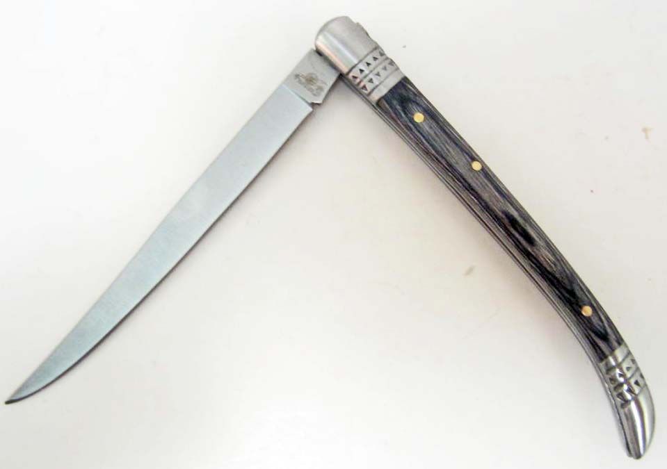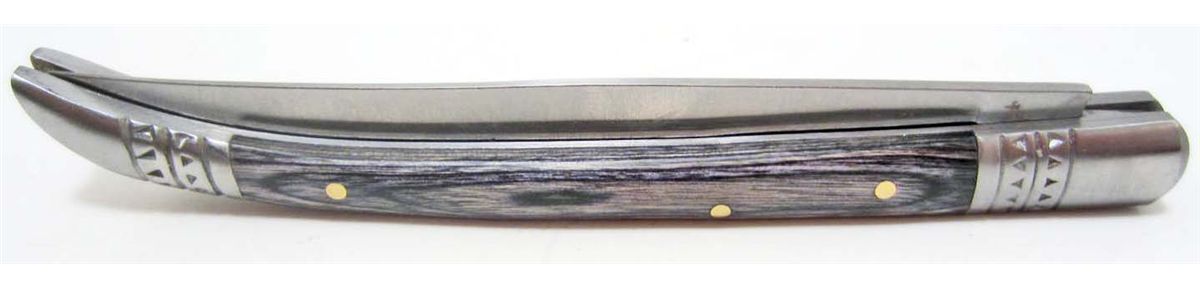 4 7/8" closed. Stainless long clip blade. Black pakkawood handles with grooved nickel silver bolsters. Backspring features filework