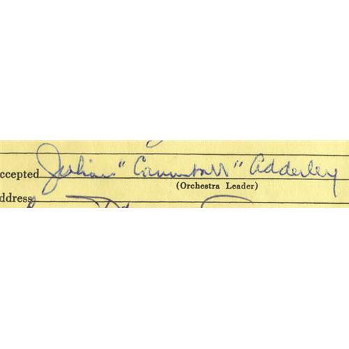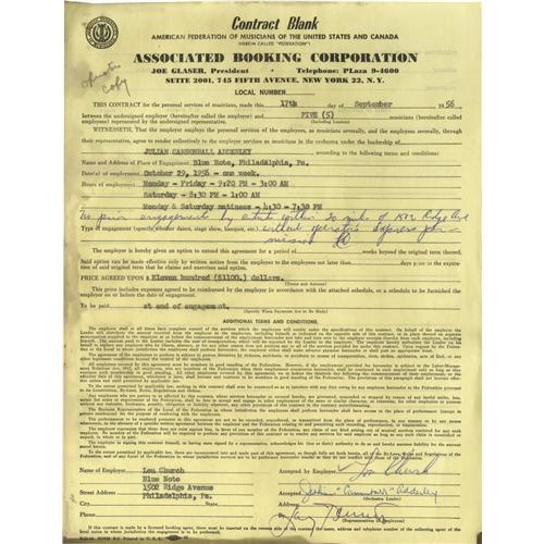 <B>Cannonball Adderley Signed Contract.</B></I> An Associated Booking contract dated September 17, 1956, engaging the sax player and his band for a performance at the Blue Note in Philadelphia, signed "Julian 'Cannonball' Adderley" by him in blue ink in the lower right-hand corner. A rare item indeed. In Fine to Very Fine condition with some areas of discoloration that do not affect the autograph.<BR><BR><b>Shipping:</b> Flat Material, Small (<a target="_blank" href="http://www.heritageauctions.com/common/shipping.php">view shipping information</a>)
