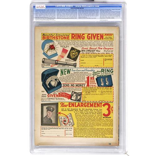 <B>Cannonball Comics #1 Davis Crippen ("D" Copy) pedigree (Rural Home, 1945) CGC VF+ 8.5 Cream to off-white pages.</B></I> This is the first copy we've seen of this issue as well as the only specimen CGC has certified as of this writing! The skull cover is certainly an attention-grabber, and you could probably win many a trivia contest by correctly naming the superhero shown here (it's the Crash Kid). Superhero, sports, and humor features fill the pages of this comic by short-lived publisher Rural Home (aka Enwil). Overstreet 2006 VF 8.0 value = $556; VF/NM 9.0 value = $878. CGC census 6/06: 1 in 8.5, none higher. <I>From the Crippen Collection.</B></I> <BR><BR><B>Important notice:</B> Heritage usually auctions material at the rate of 200-250 lots per hour. On some occasions eBay Live bid software or the Internet may not be able to keep up with the pace of the auction. We recommend placing a realistic absentee bid now as insurance to avoid disappointment. Occasionally the auctioneer may eliminate or reject an eBay Live bid, and the auctioneer may also reopen a lot after the close of the eBay live bidding (usually because we missed an audience bid), and may reject your bid even if it shows you as the winning bidder. By bidding via eBay Live, you agree that Heritage may award the lot to another bidder at its sole discretion under the circumstances described above or any other reasonable circumstances. Since eBay bids are not shown to us until we open the lot on the floor, we treat those bids just like floor bids. In most cases the floor responds before the eBay bid is presented to us, due to Internet lag time, so for consistency we have made it a policy that floor bids are always considered first over tie eBay live bids. Also please note that all Heritage lots purchased through eBay Live carry a 22.5% Buyer's Premium. Please make sure you read the Terms and Conditions before you bid. This lot is being auctioned in conjunction with a live floor auction by Heritage Auction Galleries. All final auction and invoice information will be supplied by Heritage Auction Galleries, and all other information should be considered preliminary. Lot:41001 <BR><BR><B>Winning Notification and Billing:</B> After the FINAL session in this auction is complete, Heritage will send e-mail and snail mail invoices. This process normally takes several days. All final auction and invoice information will be supplied by Heritage Auction Galleries, and all other information should be considered preliminary. <BR><BR>This auction will be conducted on a live auction floor and over the Internet through eBay Live. If you choose to place an absentee bid, please take a moment to <font color='#0000ff'><u><a href='http://pages.ebay.com/liveauctions/help/before/laabsentee.html'>learn how eBay Live absentee bidding works</a></u></font><font color='#000000'>