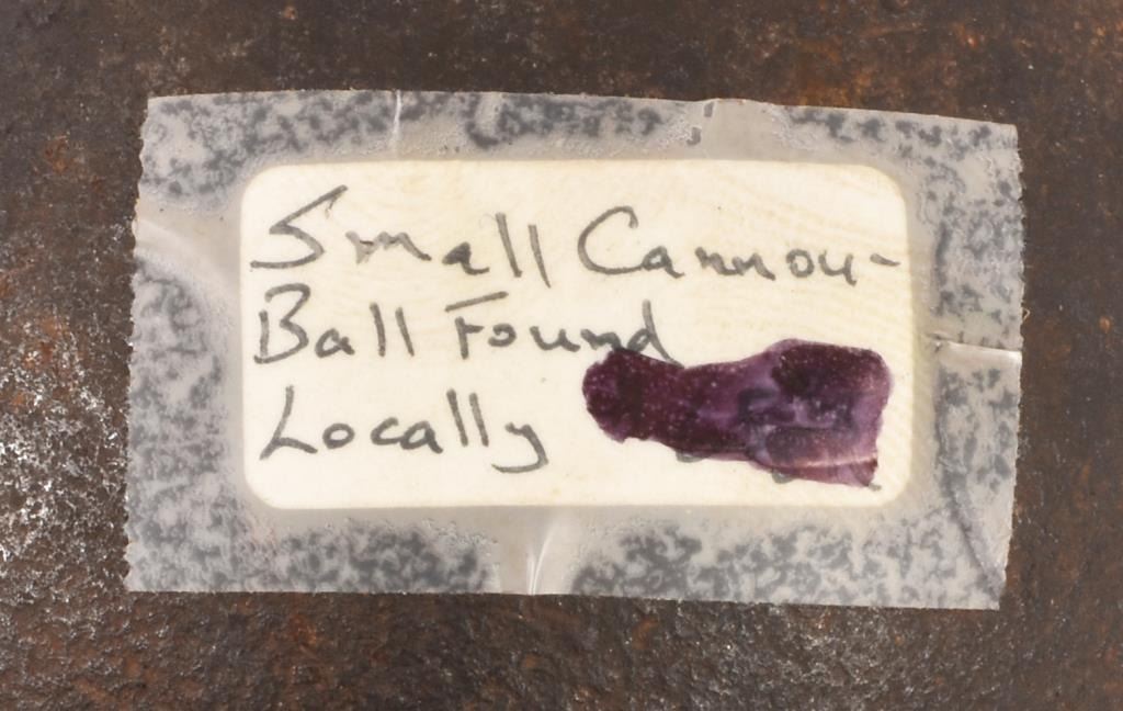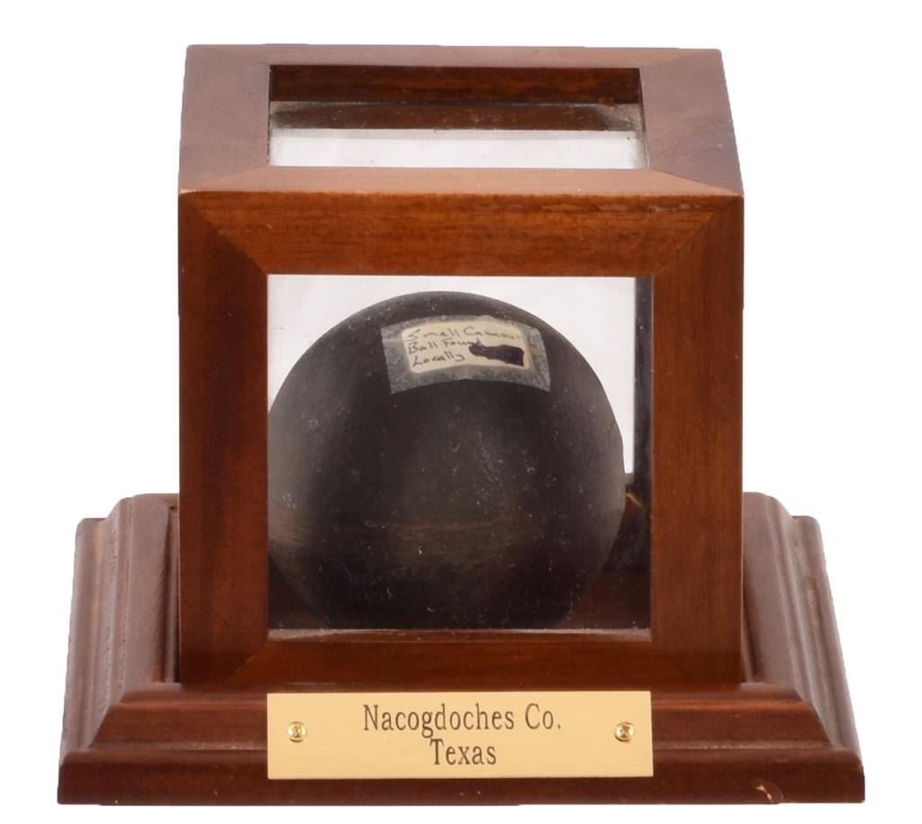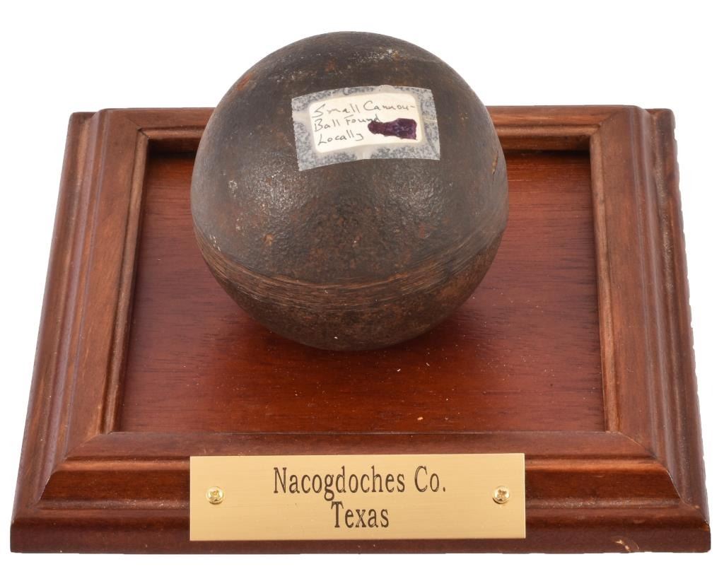 Cannonball 3" Modern case. Case 6.25" x 6.25" x 5.25". Provenance: Obtained from a local dealer and historian in Nacogdoches, Texas around 2010. Marked "Small Cannon Ball Found Locally." No further information.