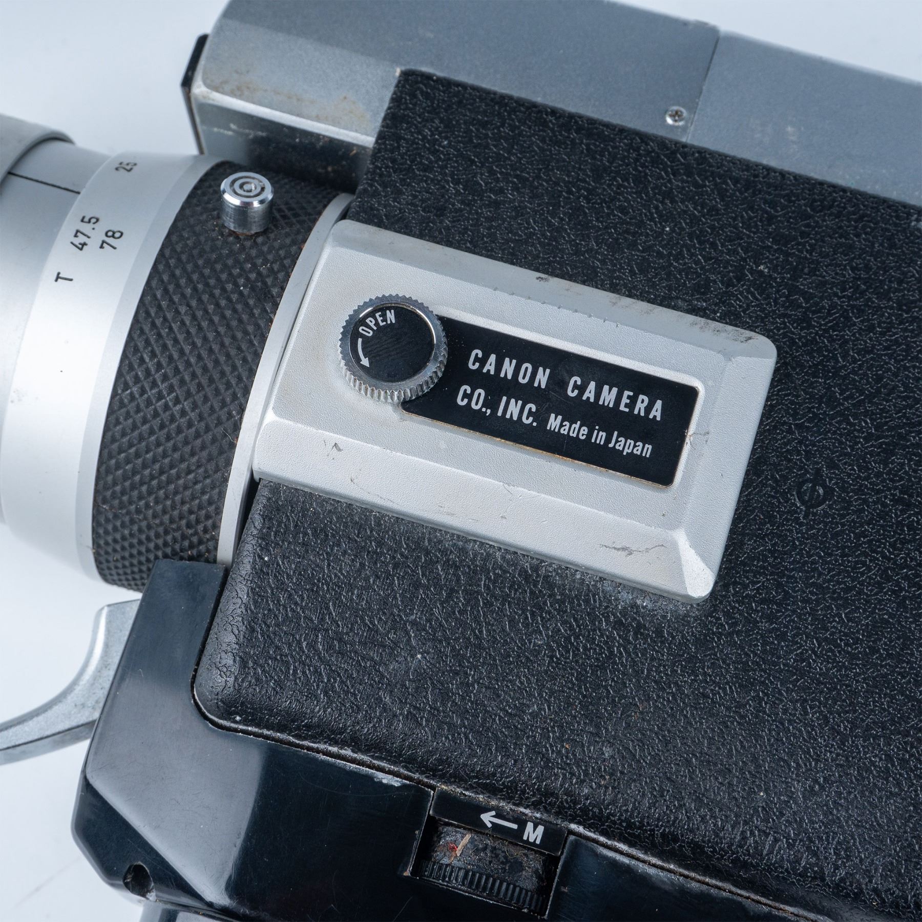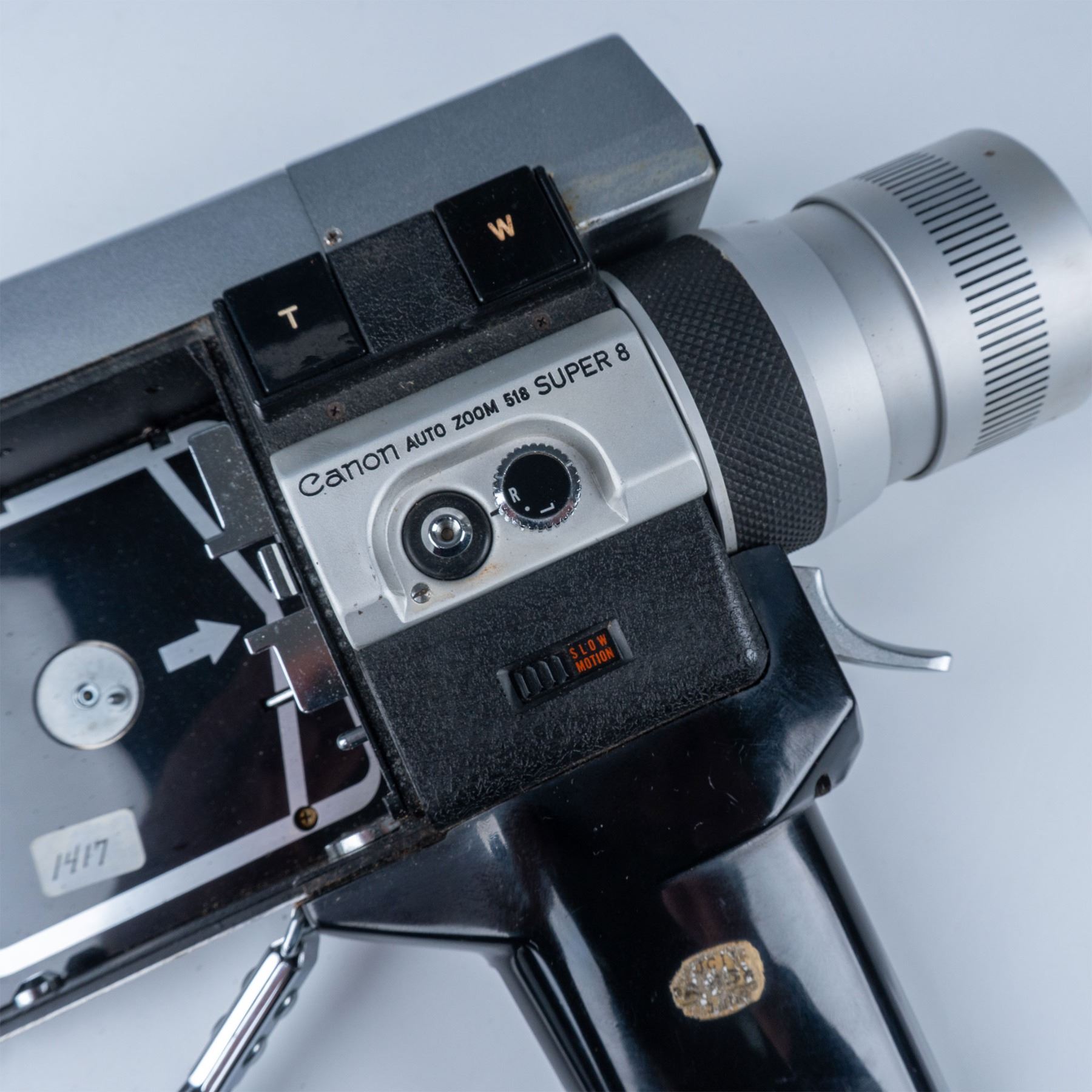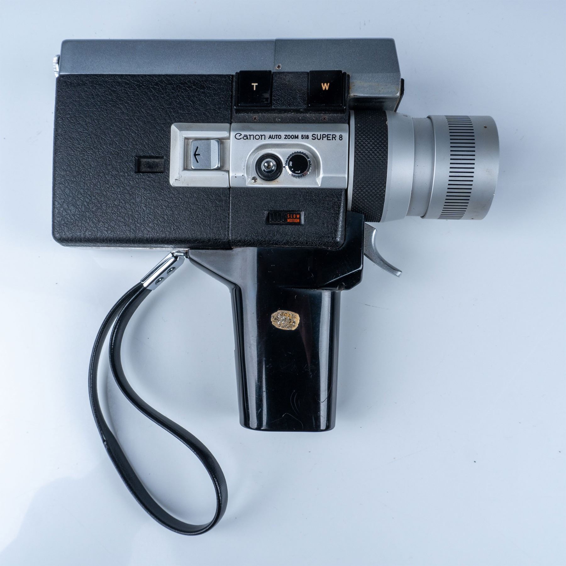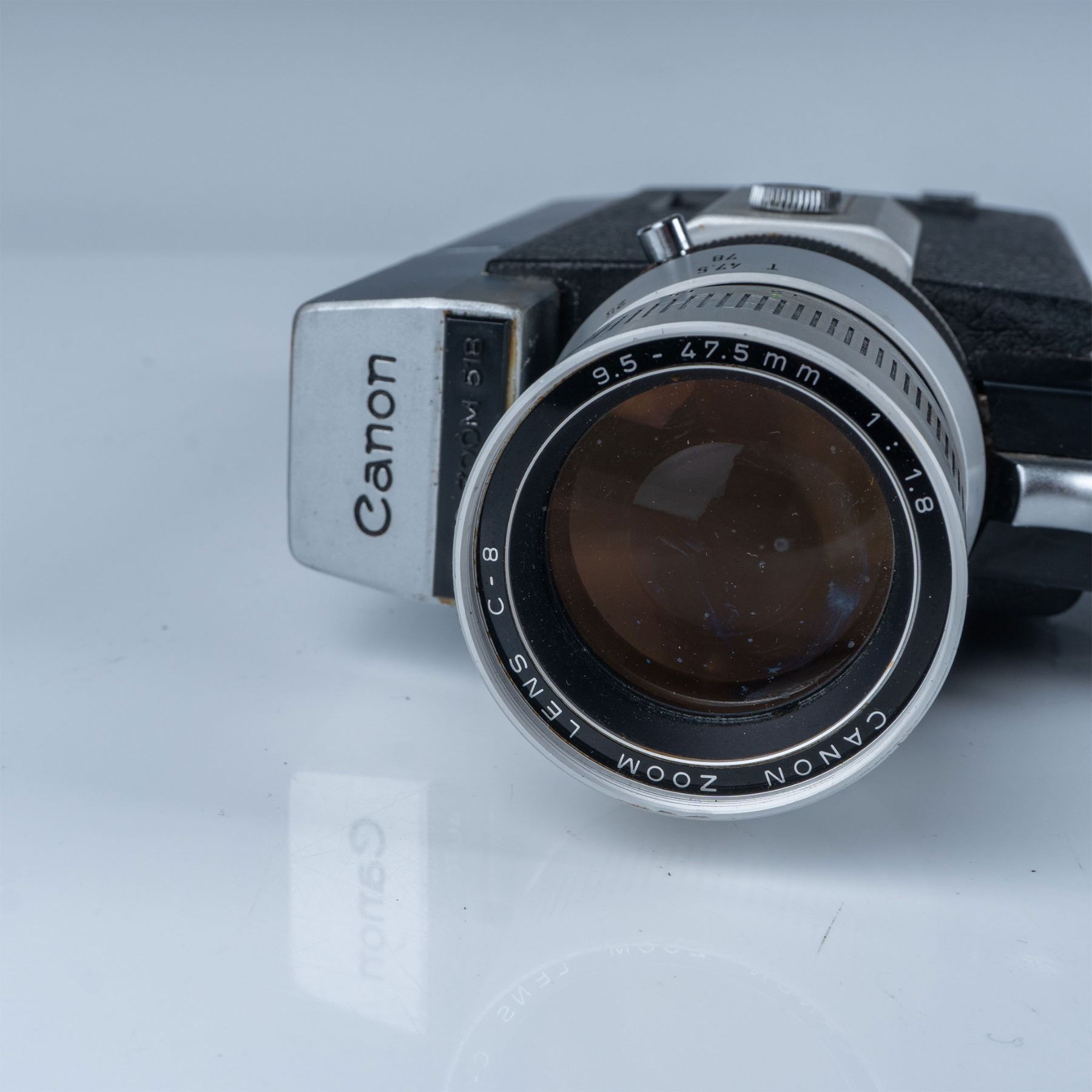 Vintage Canon Auto Zoom 518 Super 8 film camera, manufactured by Canon Camera Co., Inc. in Japan. This classic Super 8 camera features a manual zoom lens with focal lengths ranging from 9.5mm to 47.5mm and a maximum aperture of f/1.8, designed for both amateur and professional use during the height of the Super 8 film era. The camera body exhibits a sleek black-and-gray finish and comes equipped with its original ergonomic handgrip for comfortable filming. It is accompanied by its original black hard case with embossed "Canon" branding, which shows signs of wear consistent with its age.
