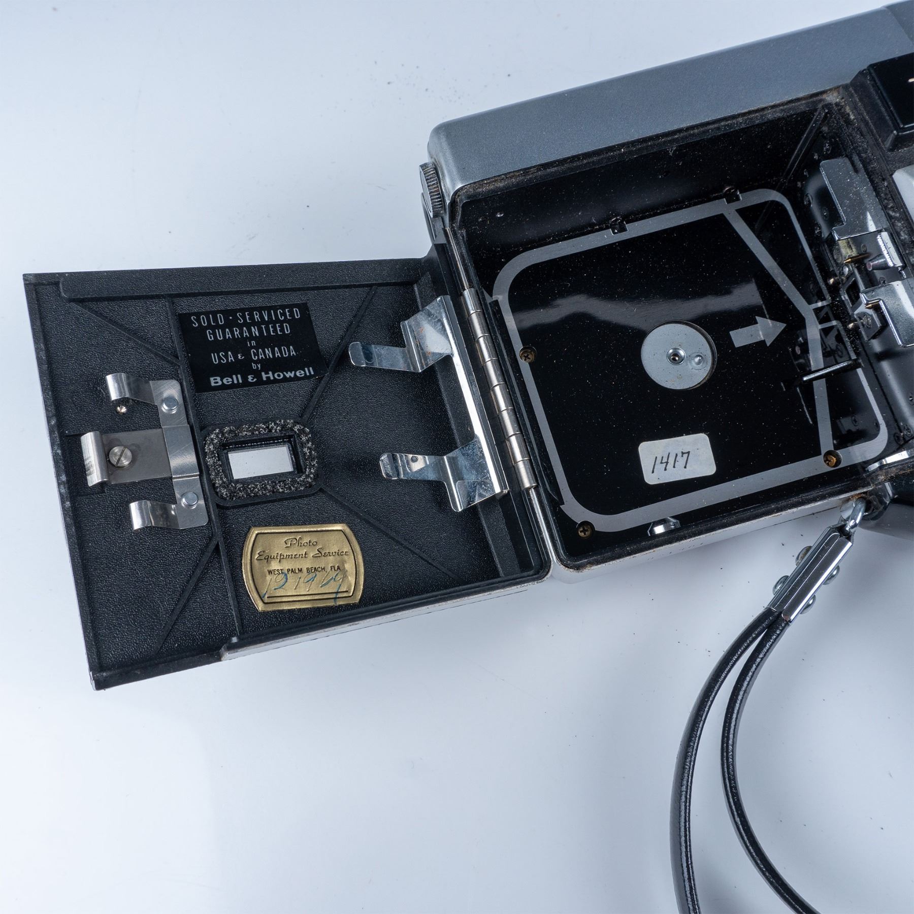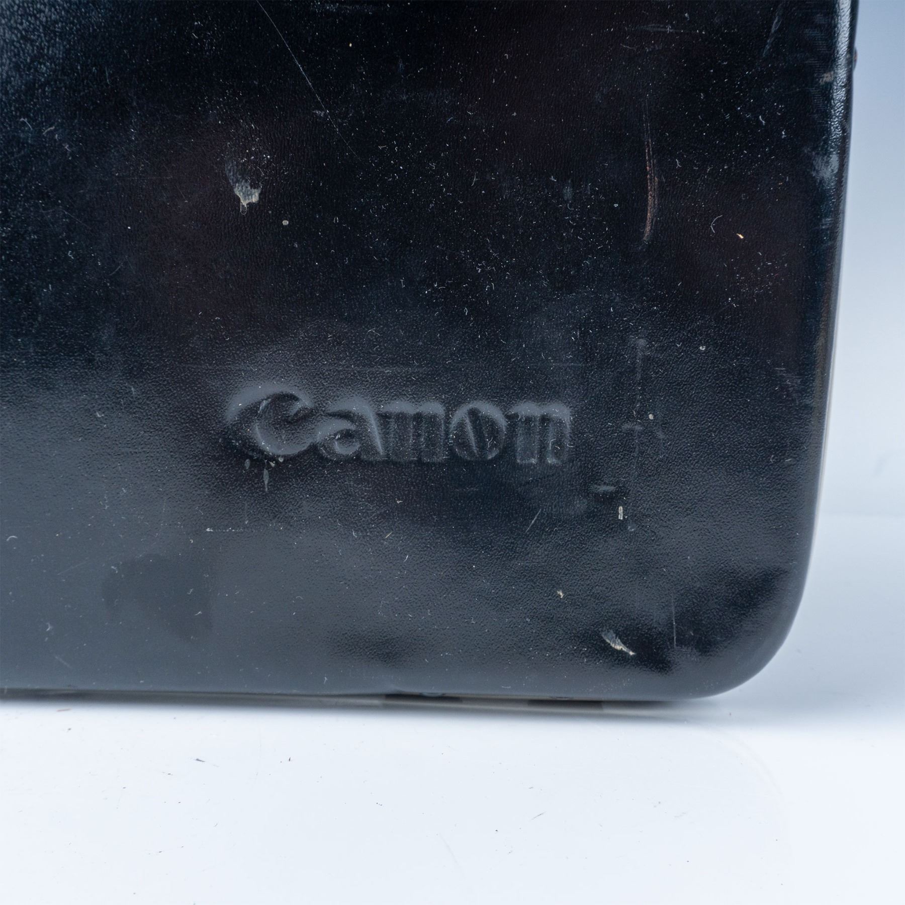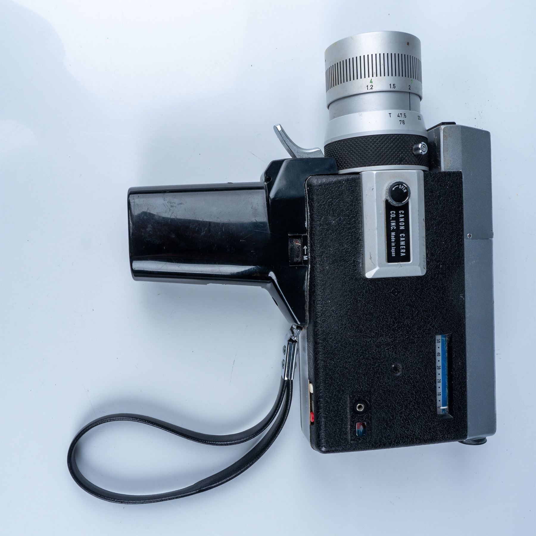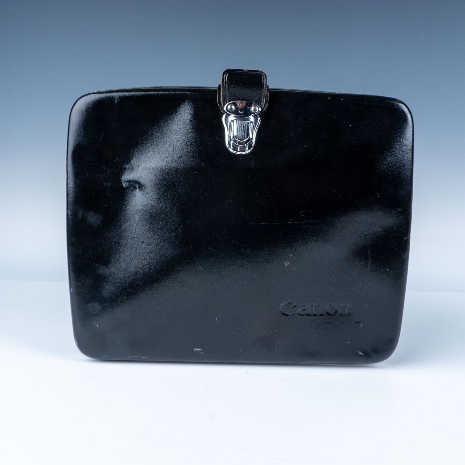 Vintage Canon Auto Zoom 518 Super 8 film camera, manufactured by Canon Camera Co., Inc. in Japan. This classic Super 8 camera features a manual zoom lens with focal lengths ranging from 9.5mm to 47.5mm and a maximum aperture of f/1.8, designed for both amateur and professional use during the height of the Super 8 film era. The camera body exhibits a sleek black-and-gray finish and comes equipped with its original ergonomic handgrip for comfortable filming. It is accompanied by its original black hard case with embossed "Canon" branding, which shows signs of wear consistent with its age.
