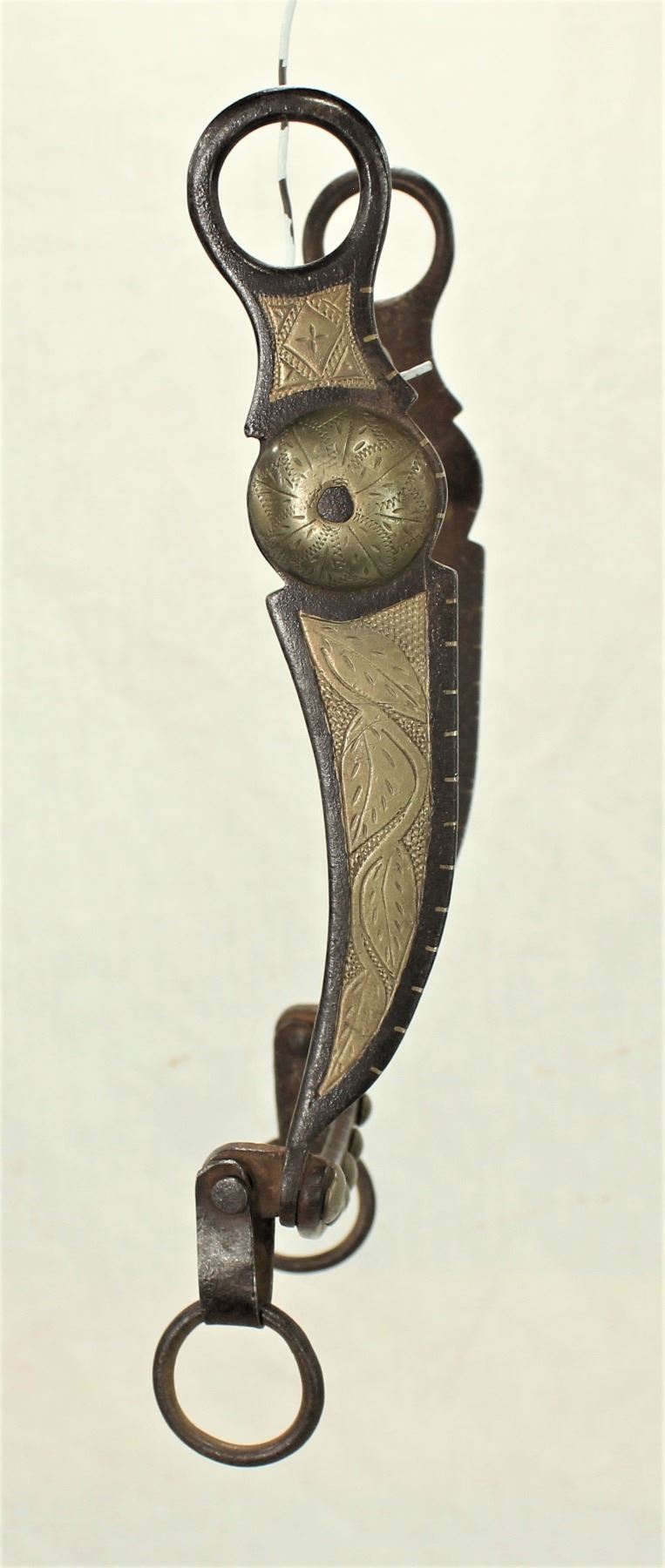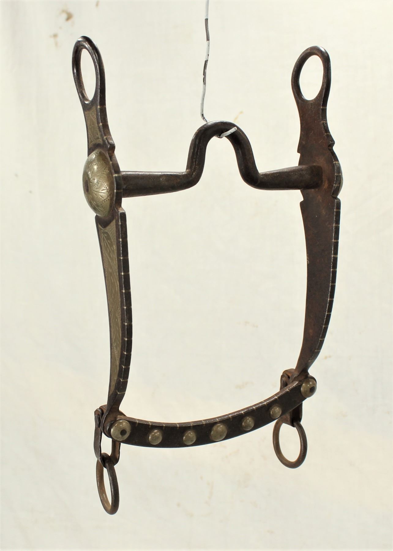 Uncommonly large banana cheek style bit, with fully inlaid cheeks, large dome conchos and lip bar. In very nice condition.