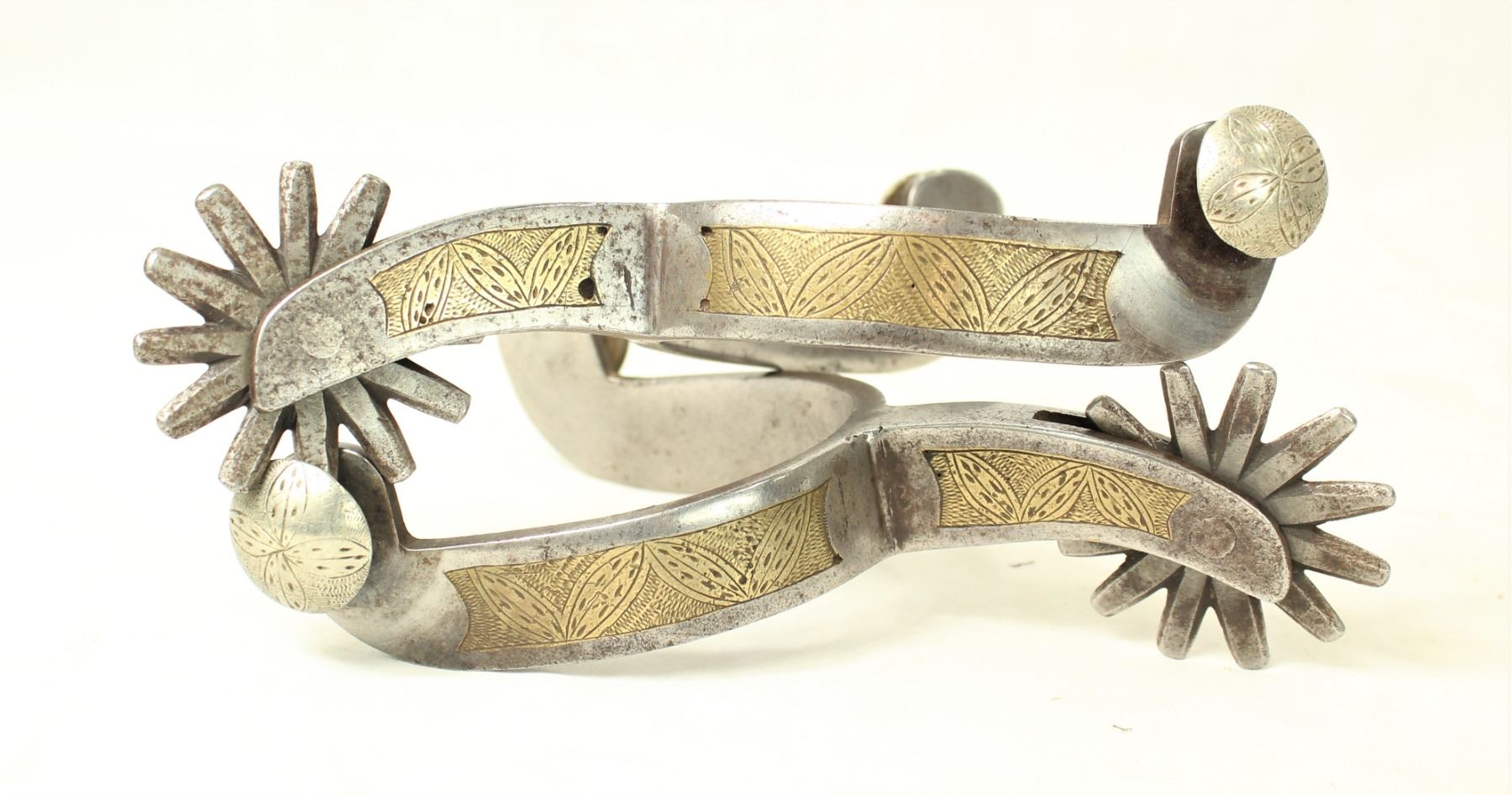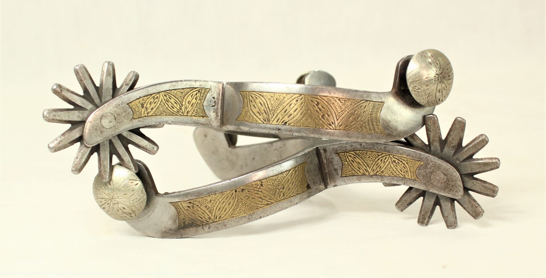 Uncommon iron double mounted Colorado prison spurs with brass inlay, engraved with classic leaf and vine pattern.