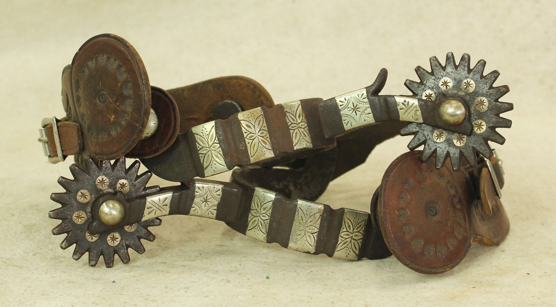 An eye catching large pair of double inlaid Colorado Penitentiary made spurs with signature characteristics of inlaid engraved silver barred heelbands, uncommon fully silver wrapped shanks and large silver adorned rowels. Complimented with basket stamped straps.