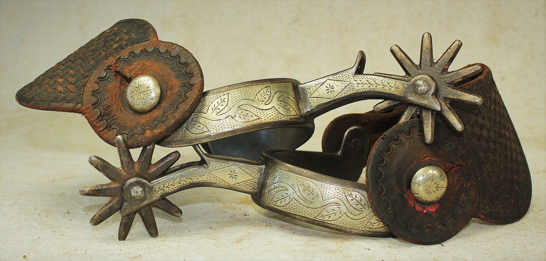 Massive pair of double inlaid Canon City Prison spurs with classic leaf and vine design and large 10 point rowels.