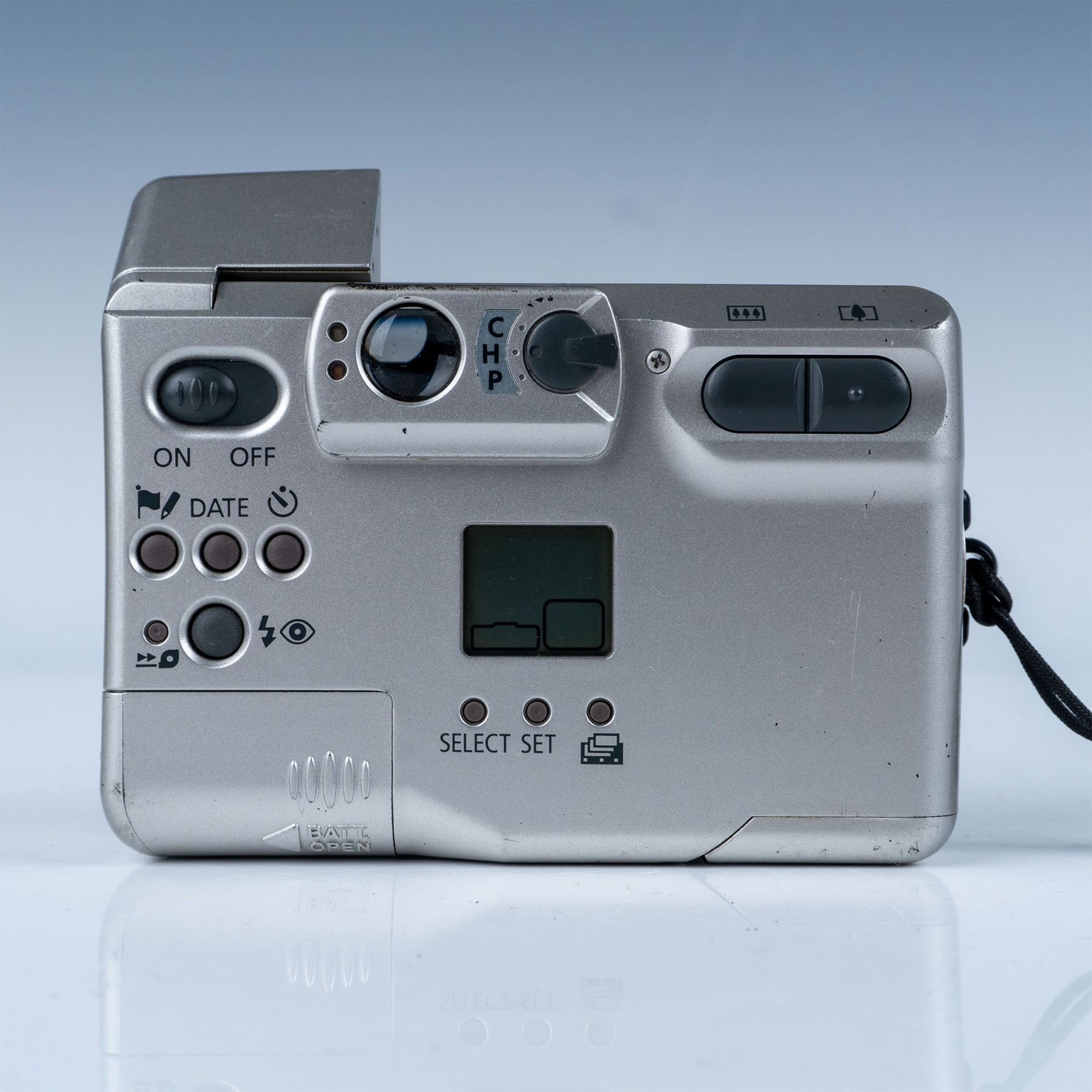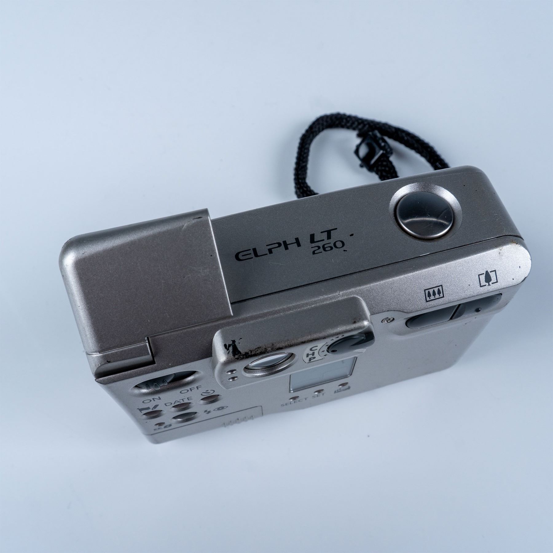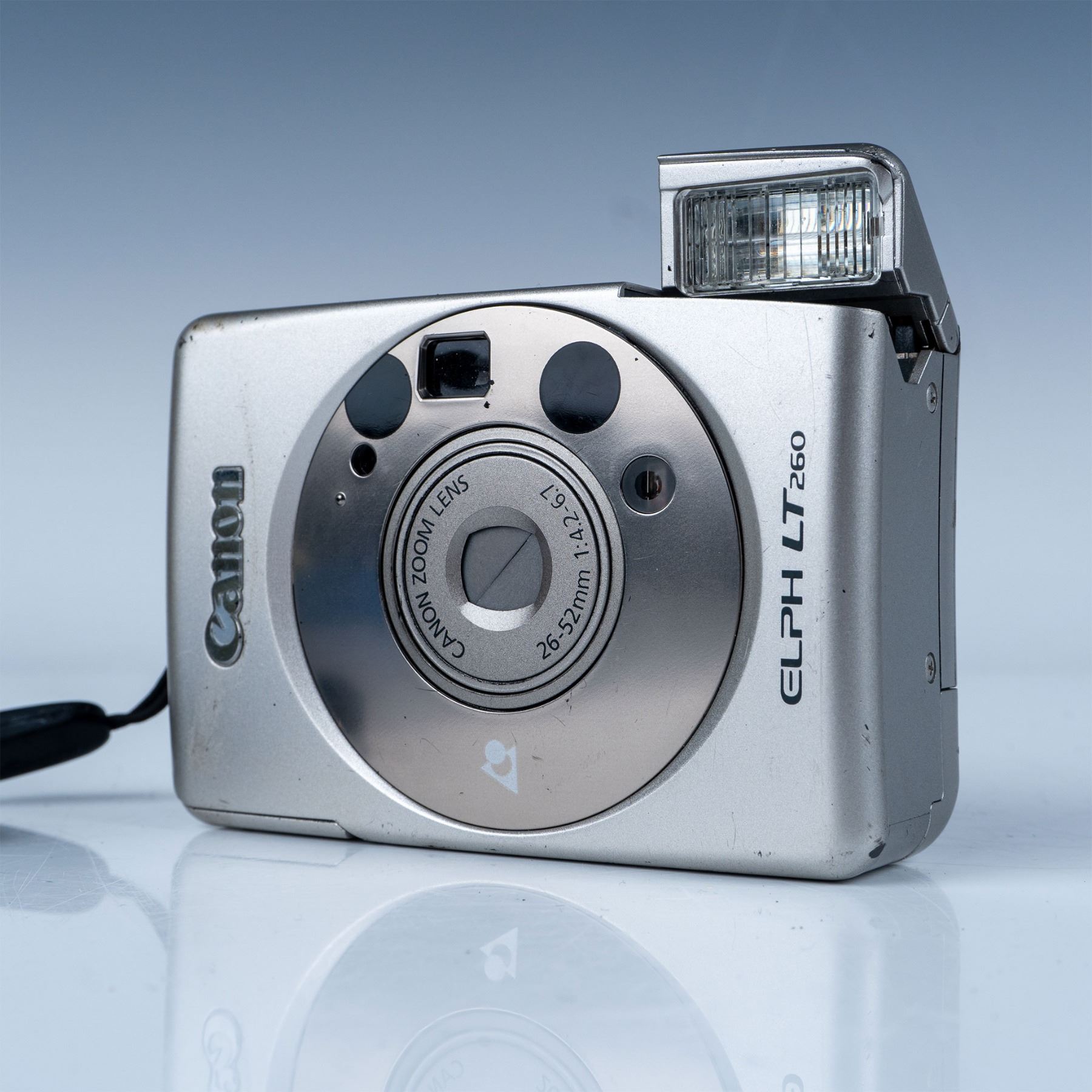 This lot features a Canon ELPH LT260 compact 35mm film camera, known for its sleek design and portability. The camera includes a built-in zoom lens with a range of 26.5mm, offering sharp and vivid images. It is accompanied by a fitted Canon-branded carrying case. This model, the LT260, is part of the APS (Advanced Photo System) lineup, celebrated for its ease of film loading and format versatility. Serial number: 4721006.