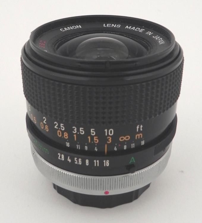 This is a Canon model FD 24mm wide angle lens. It has not been camera tested, but the rings move, and the optics appear to be in good condition, with need of a cleaning. The aperture is 1:2.8. It has an end cover, but not the front cover. * * Add this to your SLR Canon.
