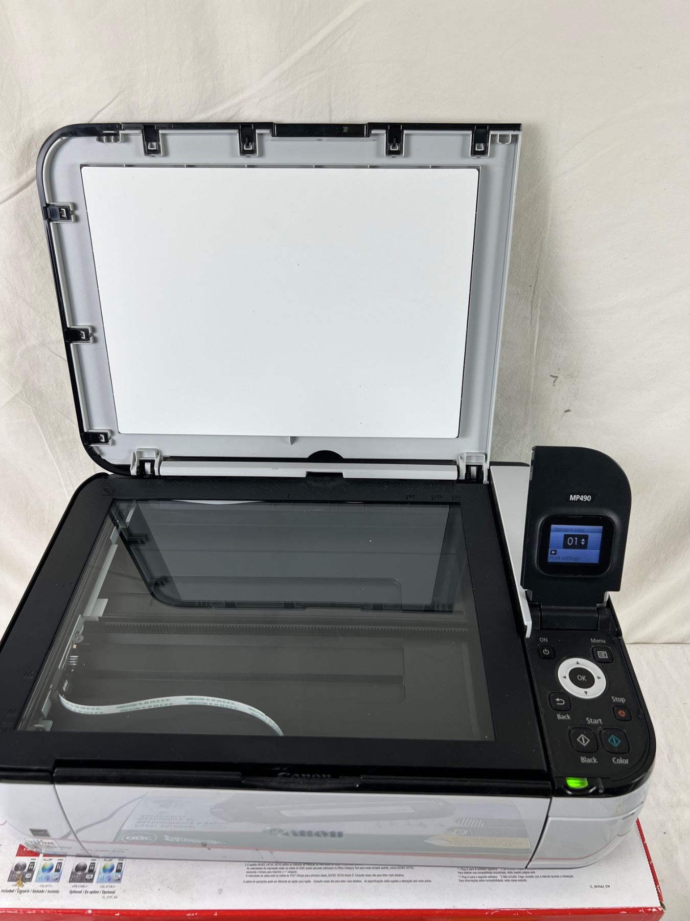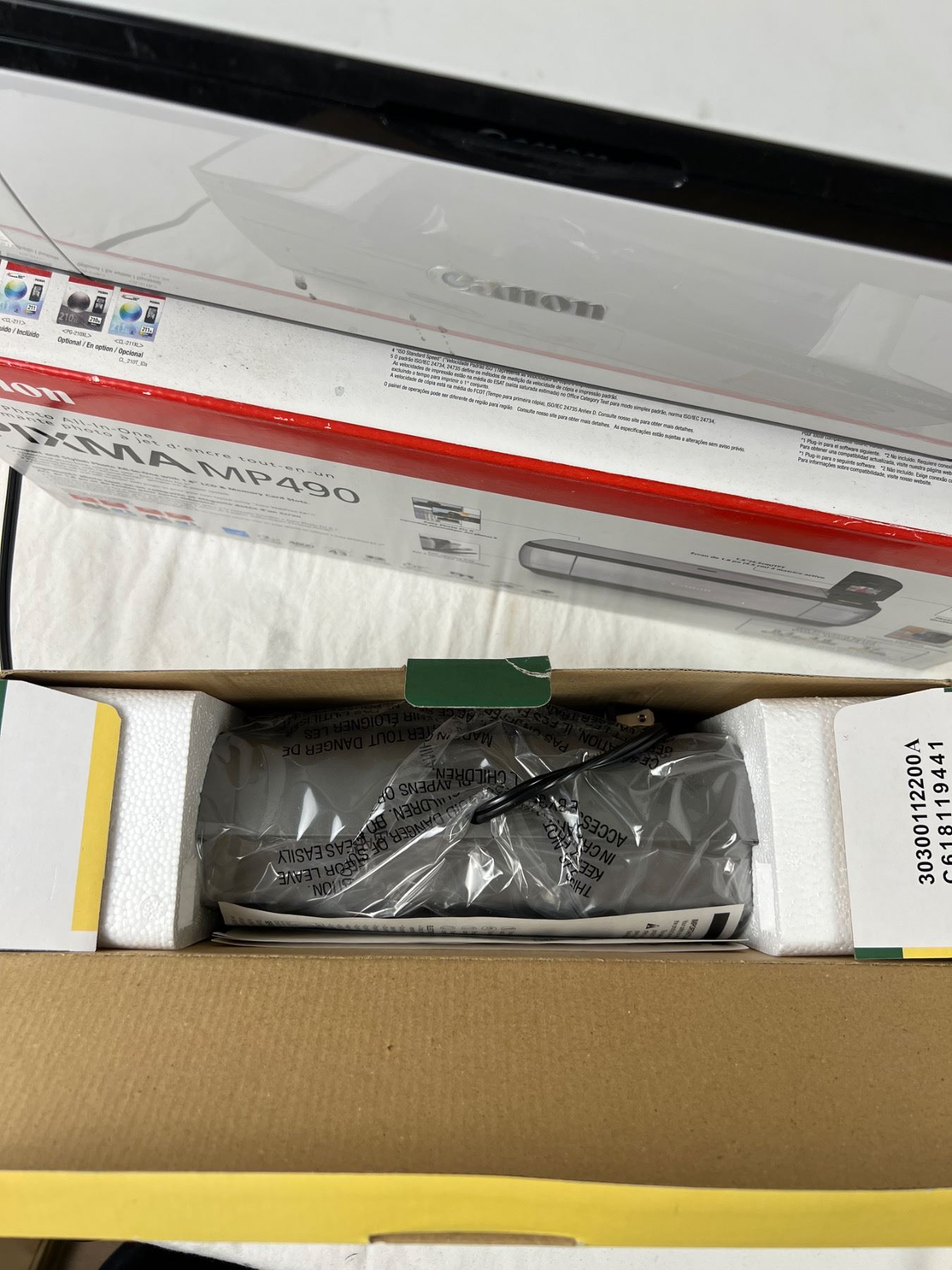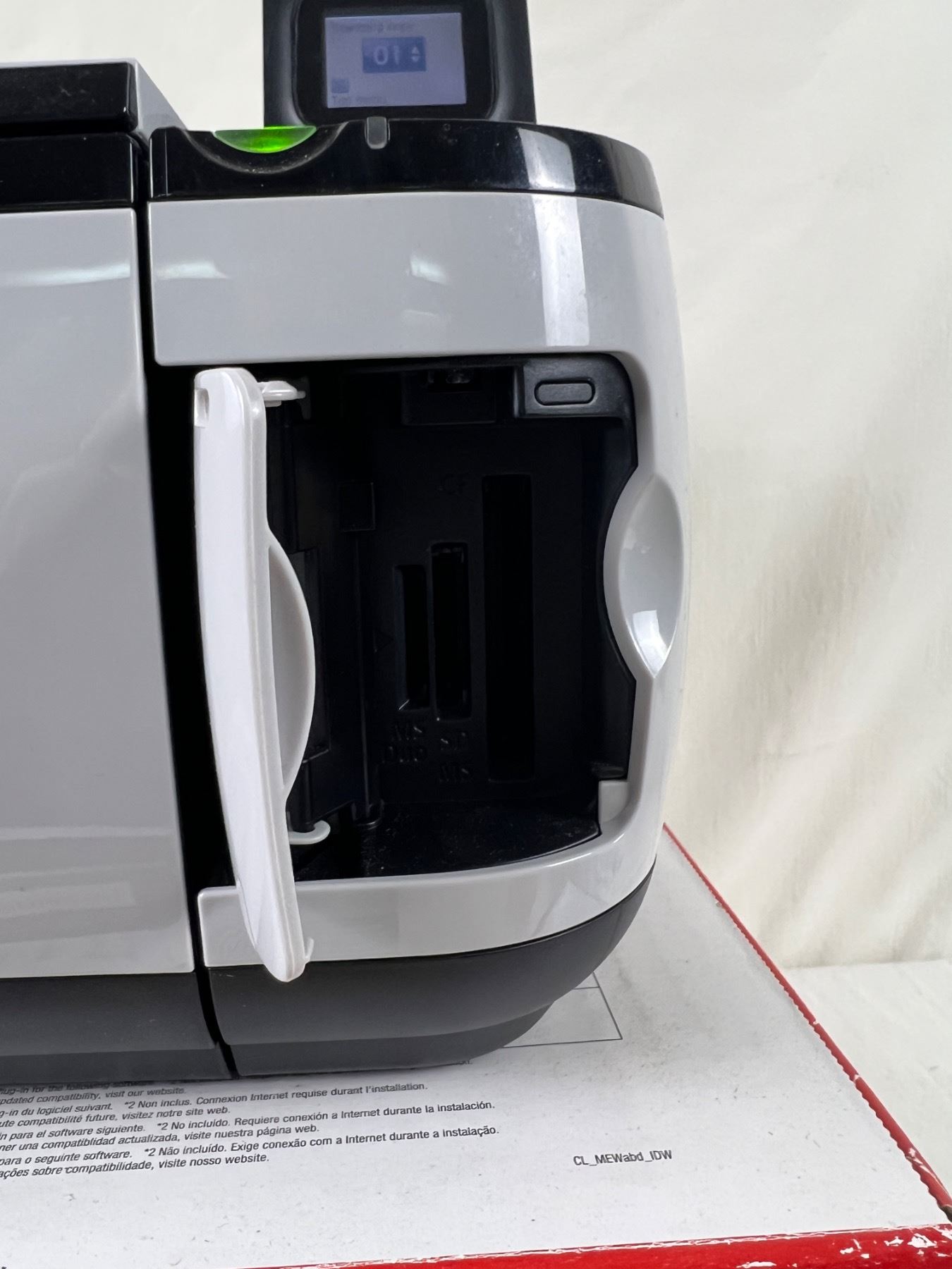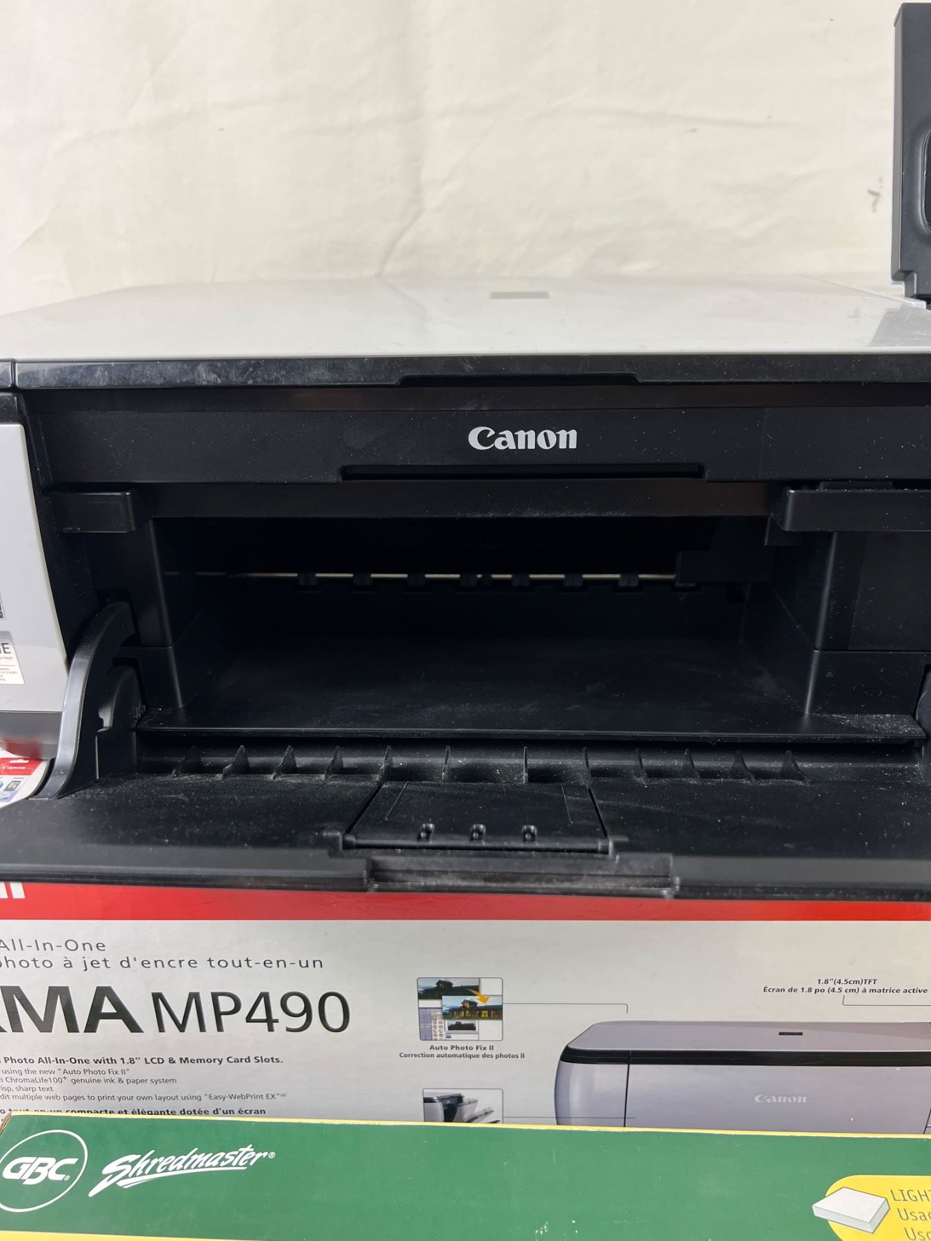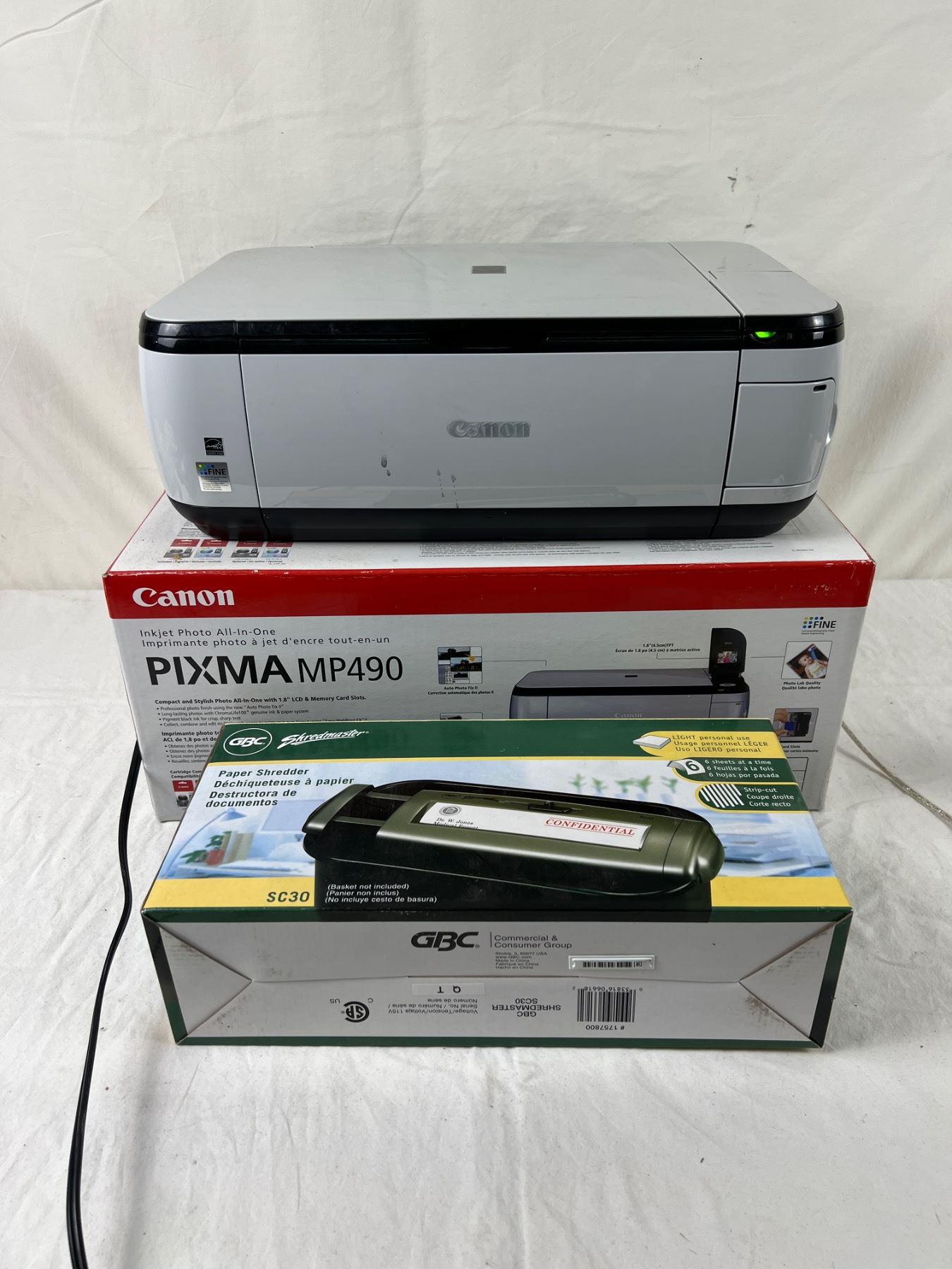 Powers on. Includes power cable and USB Printer cable. New in box shredder. Some stains on front of printer.