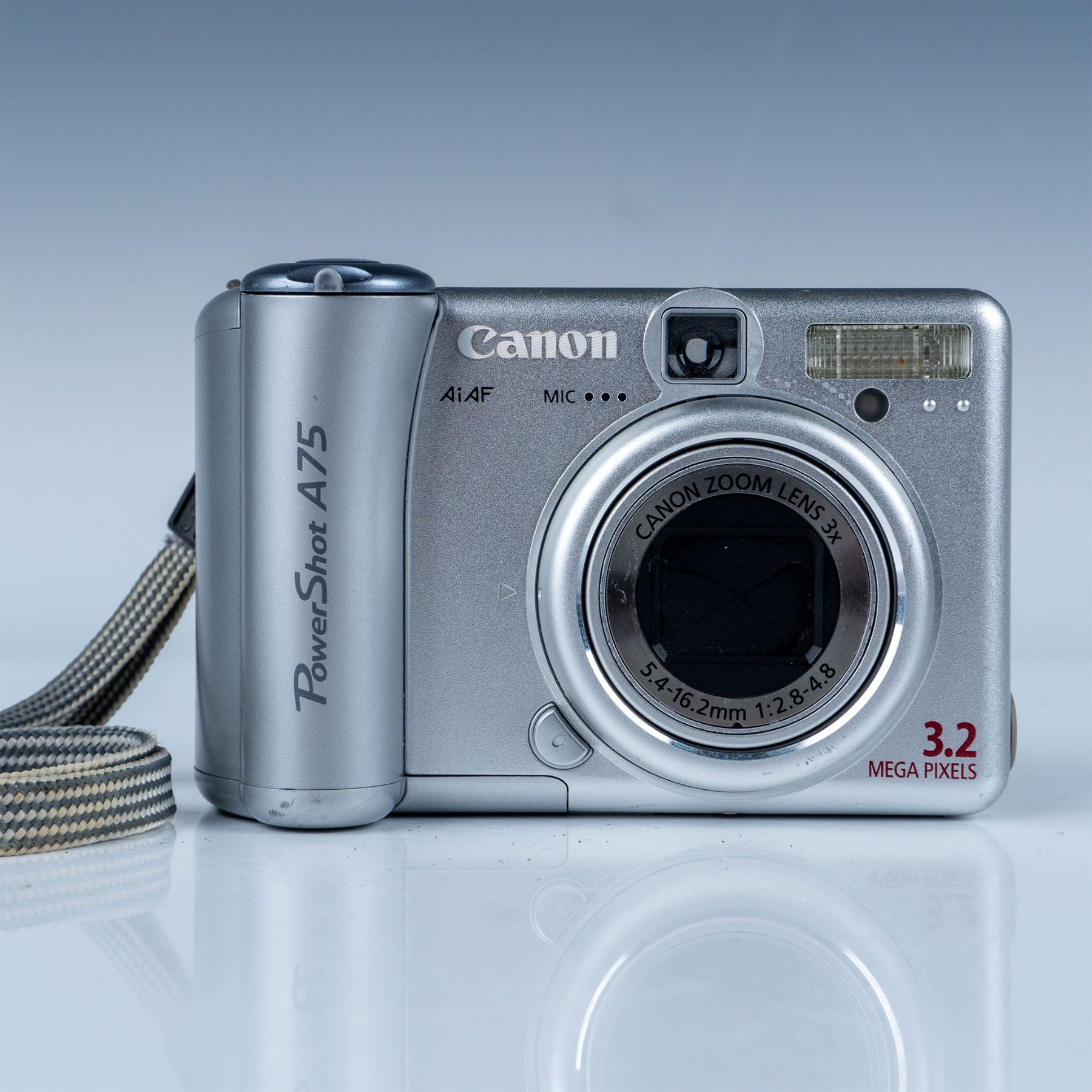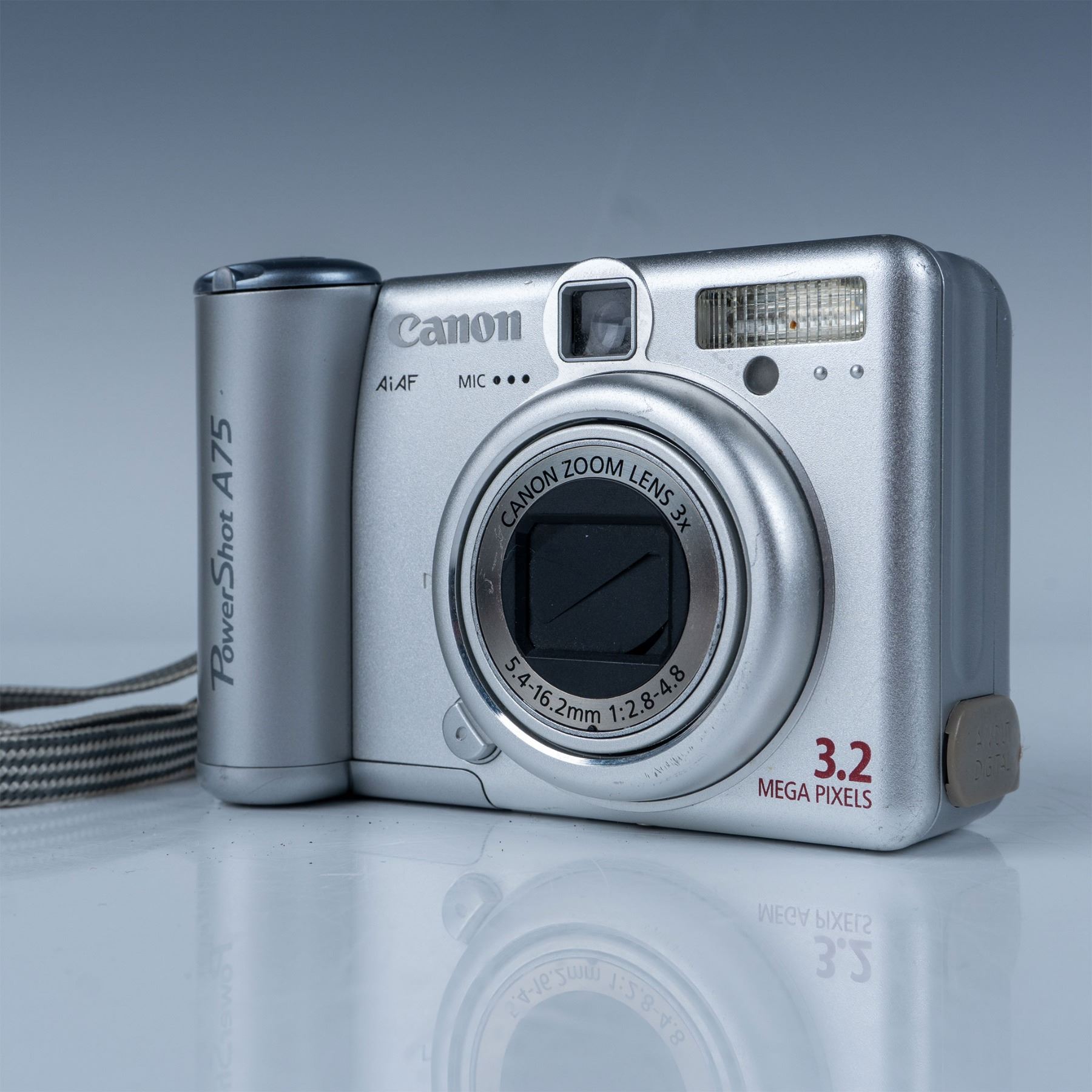 Offered here is a vintage Canon PowerShot A75 digital camera, a compact point-and-shoot camera from the early 2000s. This model features a 3.2-megapixel CCD sensor and a Canon Zoom Lens with 3x optical zoom (5.4–16.2mm focal length, f/2.8–4.8 aperture). Known for its user-friendly design and versatile functionality, the PowerShot A75 was a popular choice for casual photographers and hobbyists.