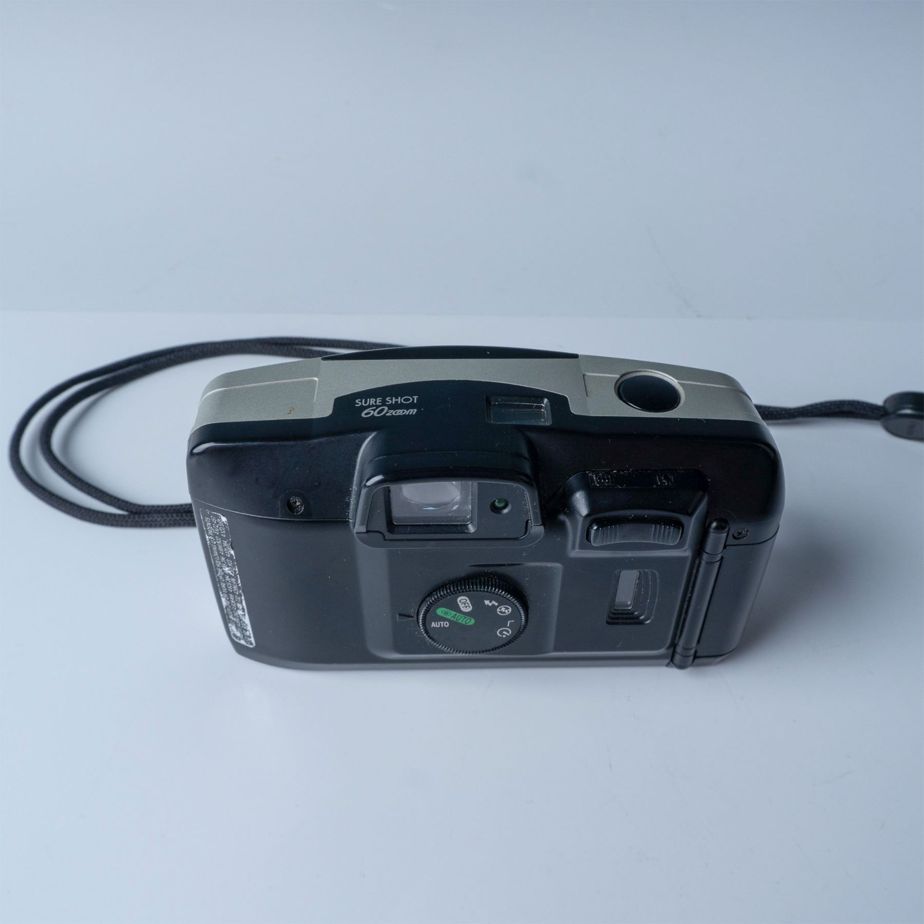 Canon Sure Shot 60 Zoom 35mm film camera, featuring a Canon Zoom Lens 38-60mm f/4.5-6.7. This compact, lightweight camera was manufactured in Malaysia and designed for casual and travel photography, offering automatic flash and focus settings. The camera includes a built-in strap and demonstrates a sturdy ergonomic design for ease of handling. Marked with Canon branding and backstamp on the underside.