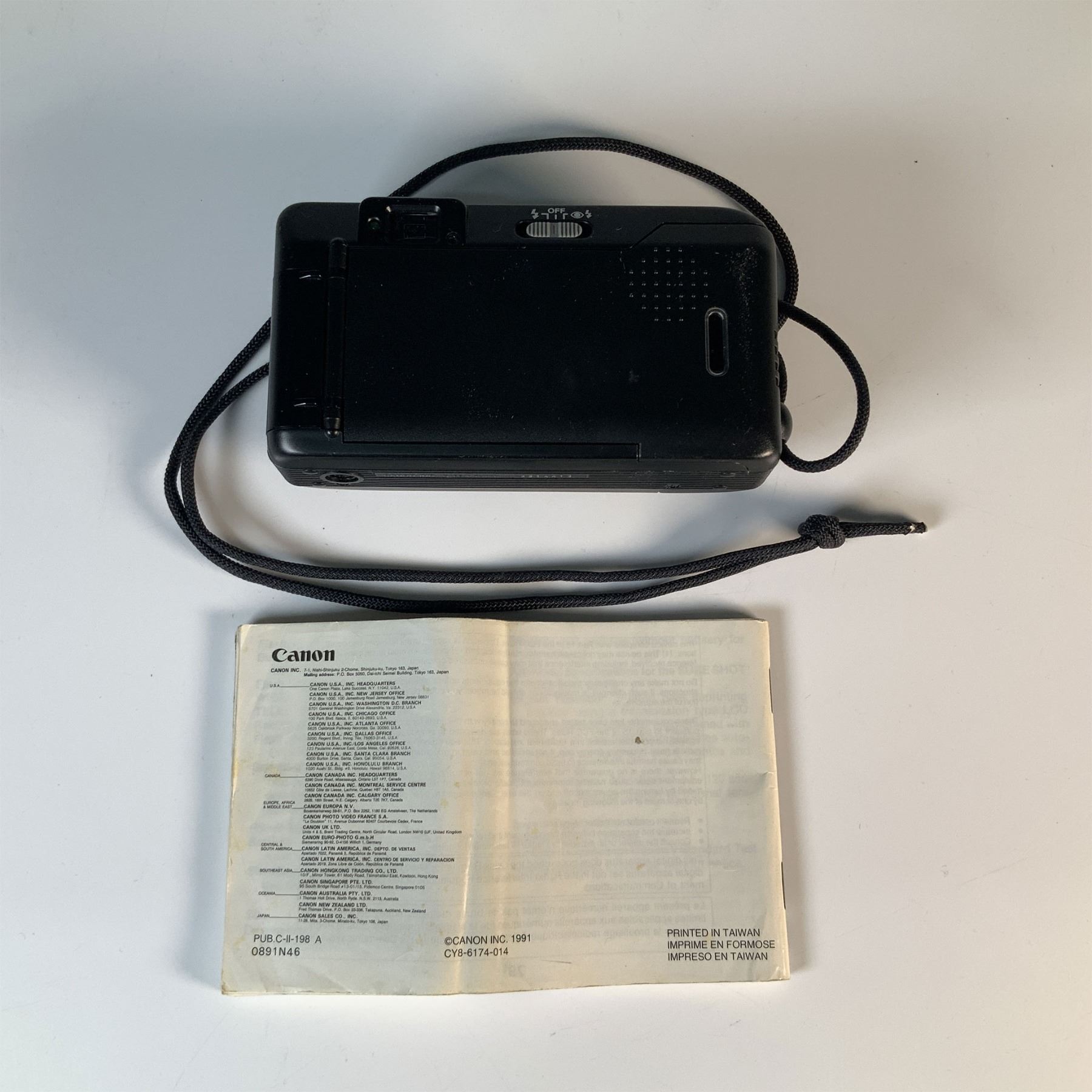 Canon Sure Shot Telemax compact 35mm film camera featuring a 38-70mm lens with autofocus and built-in flash. This camera includes red-eye reduction and multiple shooting modes, making it ideal for versatile photography. The lot also includes the original user manual for reference.