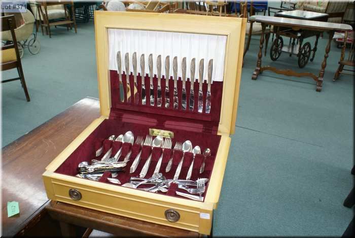 Canteen of Rogers Bros silver plate flatware "Lilac Time" including settings for twelve of dinner knives, dinner forks, desert forks, tea spoons, table spoons, coffee spoons plus assorted extras