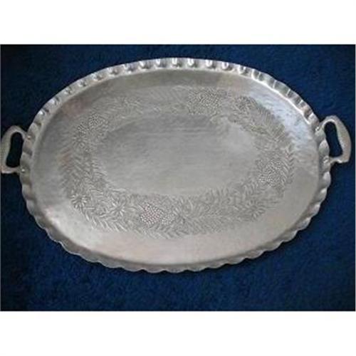 This beautifull designed flower and leaf patterned handled serving tray with serrated edging is marked: Canterbury Arts. <BR>Canterbury Arts was one of the lesser-known and smaller American companies that produced decorative aluminum serving pieces during the mid-1900s. Two artists, Chester C. Pflanz and J. Hatterick (or Hattrick), ran the company, which appears to have operated in upstate New York in the 1940s. <BR>Hand hammered the oval design consists of grapes, thistle and wild flowers and leaves with a serrated egde and 2 applied handles. In very good condition without dings or dents, it is in need of a good cleaning as it has some age spots which I have shown in my pictures and it measures 3/8 inch high, 25 inches long and 17 1/2 inches wide. An addition to any Vintage Aluminum or Canterbury Arts Collection. <BR>SH & Ins. will be quoted after orders placed. If you have any other questions please contact me and thank you for looking.