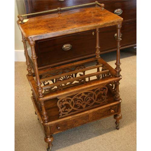 Fine English Victorian Burl Walnut inlaid Canterbury (Sheet Music/Magazines) Fine fret work. Original porcelain castors. Brass Gallery.