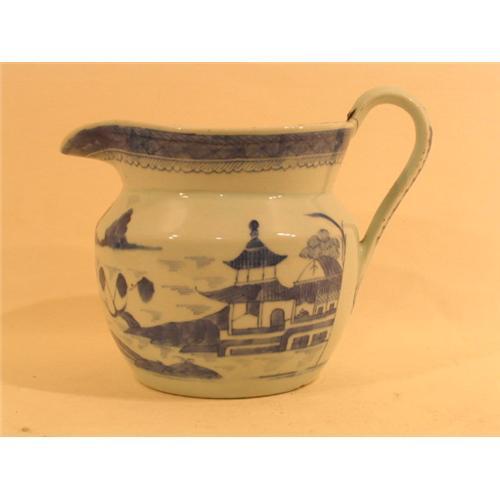 Large form Chinese export 'Canton' pitcher in the early North American market style. "Rain and cloud" border. Underglazed blue and white floral decoration. There exists a very old and very sturdy cleat repair to the top of the handle. Large form measuring 6 7/8" high by 6 1/4" across. 10 1/4" spout to handle. First quarter 19th century.