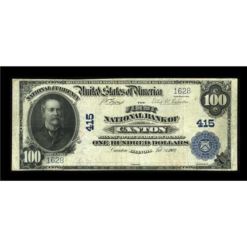 <B>Canton, IL</B></I> - $100 1902 Date Back Fr. 689 <B>The First NB</B></I> Ch. # 415<BR>Only two examples of this type are currently known. Pleasing eye appeal is noticed on this <B>Fine-Very Fine</B></I> with decent color though a pinhole has pierced the portrait area.<BR><I>From The Lincoln Collection</B></I><BR><BR><b>Shipping:</b> Coins & Currency (<a target="_blank" href="http://www.heritageauctions.com/common/shipping.php">view shipping information</a>)