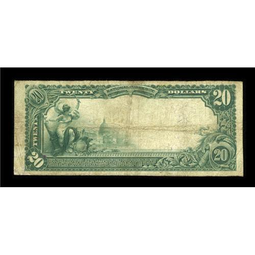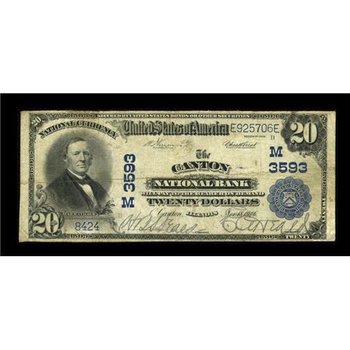 <B>Canton, IL</B></I> - $20 1902 Plain Back Fr. 652 <B>The Canton NB</B></I> Ch. # (M)3593<BR>This institution went into receivership in 1933, but not before issuing more than $1.5 Million in National Currency. This piece is solid for the grade and features strong remaining signatures. <B>Very Good-Fine.</B></I><BR><I>From The Lincoln Collection</B></I><BR><BR><b>Shipping:</b> Coins & Currency (<a target="_blank" href="http://www.heritageauctions.com/common/shipping.php">view shipping information</a>)