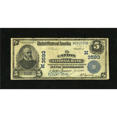 <B>Canton, IL</B></I> - $5 1902 Date Back Fr. 592 <B>The Canton NB</B></I> Ch. # (M)3593<BR>Geographical sort letters are noted on this boldy printed and well signed issue. <B>About Fine.</B></I><BR><I>From The Lincoln Collection</B></I><BR><BR><b>Shipping:</b> Coins & Currency (<a target="_blank" href="http://www.heritageauctions.com/common/shipping.php">view shipping information</a>)
