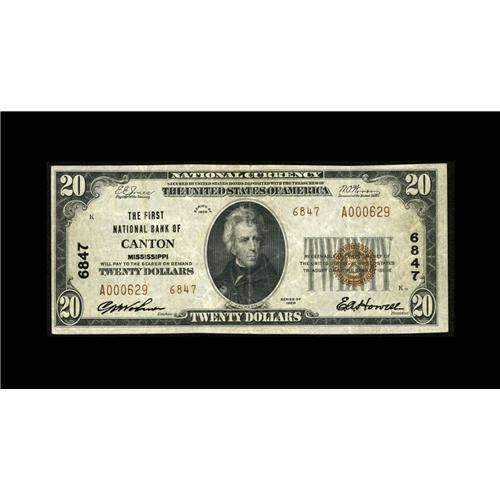 <B>Canton, MS</B></I> - $20 1929 Ty. 2 <B>The First NB</B></I> Ch. # 6847<BR>A nice grade Type 2 example from the only bank in town to issue. <B>Very Fine.</B></I>