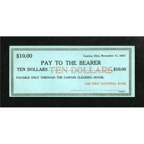 <B>Canton, OH- Canton Clearing House</B></I> $10 Nov. 11, 1907<BR>This is a piece of Panic of 1907 scrip issued from the First National Bank. Most issues of Panic of 1907 Scrip are down right scarce. <B>Choice Crisp Uncirculated,</B></I> unissued, on blue paper.<BR><BR><b>Shipping:</b> Coins & Currency (<a target="_blank" href="http://www.heritageauctions.com/common/shipping.php">view shipping information</a>)