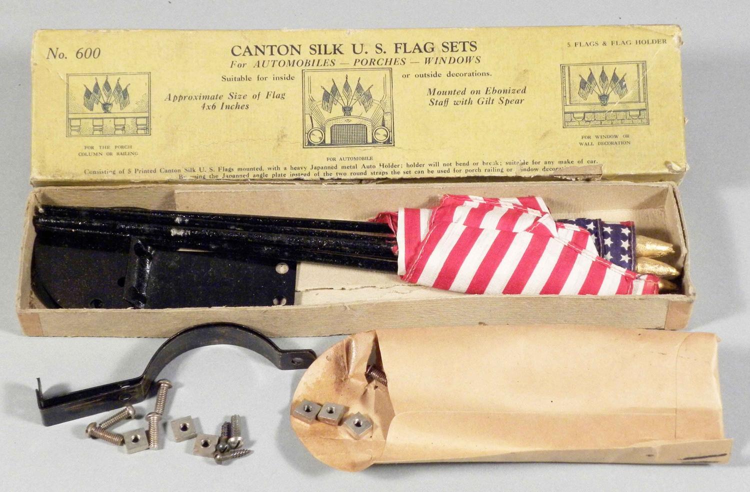 Canton Silk U. S. Flag Set in original box. For Automobiles. Mounted on ebonized staff and gilt spear. 5 flags and holder. Flags in excellent condition, box fair. Flag size 4 X 6 inches. Starting bid $40