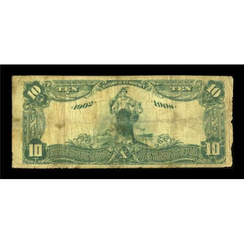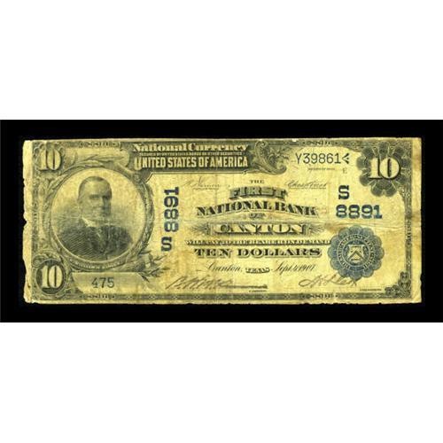 <B>Canton, TX</B></I> - $10 1902 Date Back Fr. 618 <B>The First NB</B></I> Ch. # (S)8891<BR> This is an excessively rare north Texas note from a community known far and wide for its "Trade Days," a longstanding tradition which brings in thousands of visitors to deal with many hundreds of vendors of everything from used clothes to new computers. This was the only bank in town to issue, and it is as rare as all get out, with the census standing at just two large and one small note. Even the greatest and most advanced Texas collections came up short on obtaining even one piece from Canton, with this town missing from Carter, Everson, Irish, and Ivy's holdings. Well circulated but intact <B>Very Good,</B></I> a great note despite its lack of grade. <BR><BR><b>Shipping:</b> Coins & Currency (<a target="_blank" href="http://www.heritageauctions.com/common/shipping.php">view shipping information</a>)