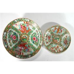 Cantonese porcelain bowl and saucer, hand enamelled with panels of flowers and figures, largest 21cm diameter