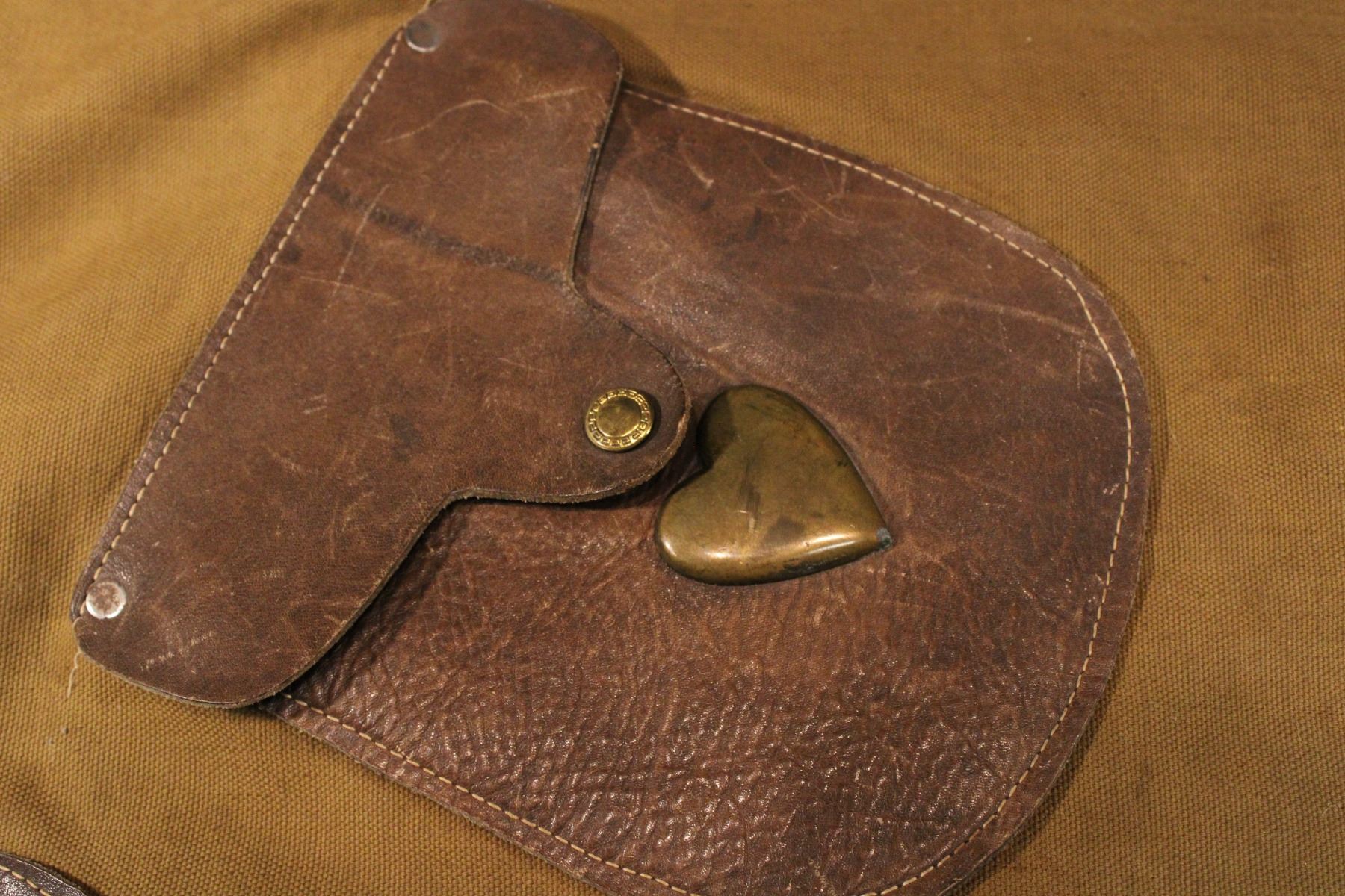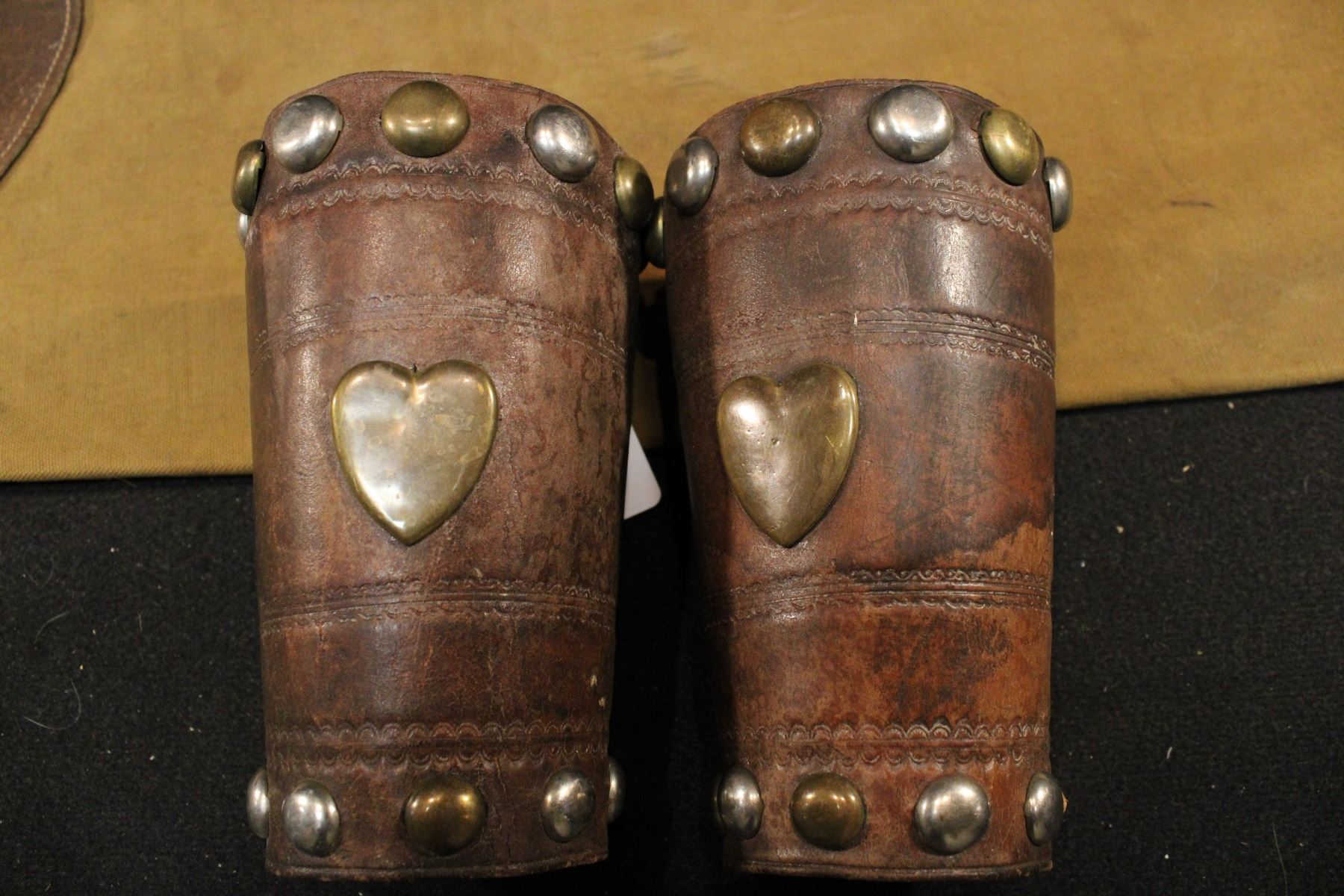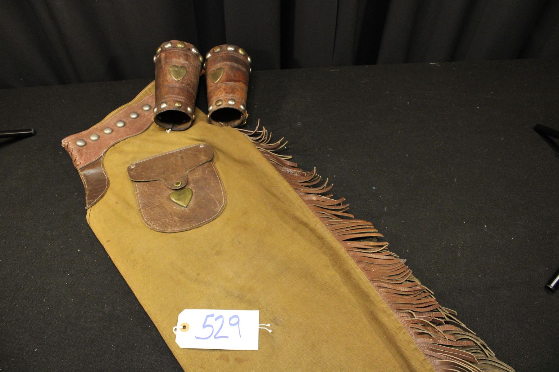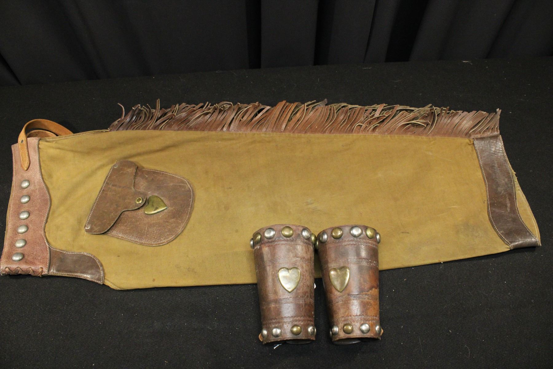 Lot of rare canvas chaps w/ matching cuffs. Leather waistband, pockets, cuffs. Brass hearts/ nickle studds. 38"
