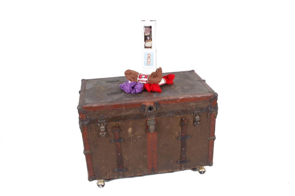 Canvas & Leather Shipping Trunk Includes contents. Trunk measures 36"Lx21"Wx26"H.Includes contents. Trunk measures 36"Lx21"Wx26"H.