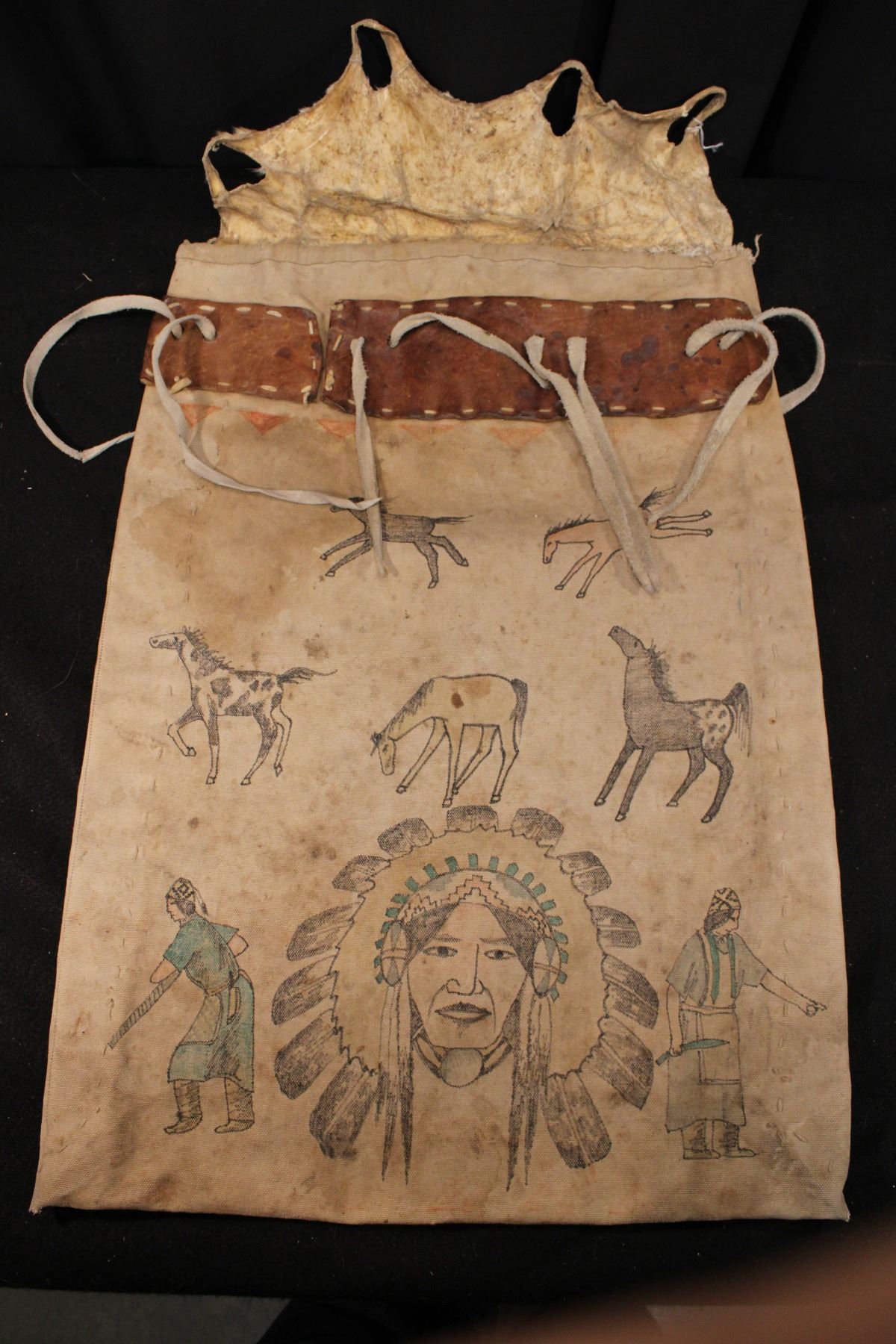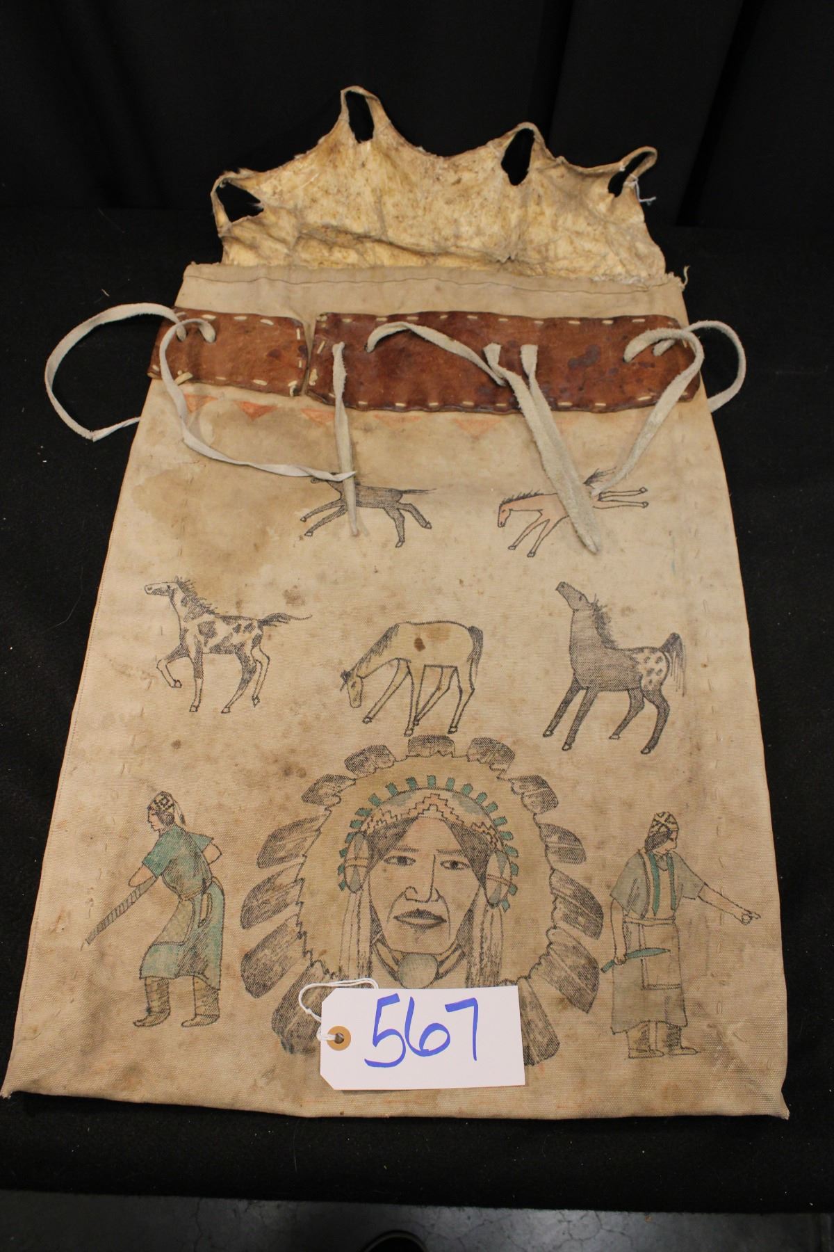 Rawhide top/ some hair. Leather closures. Root gathering and horse drawings. 18.5 x 25.5